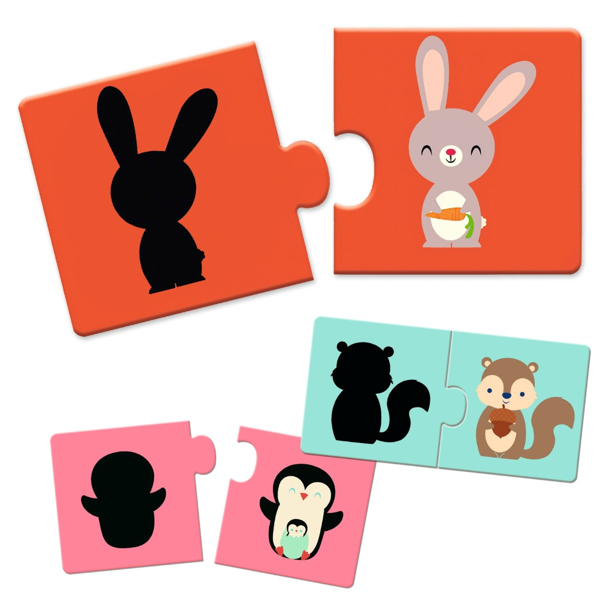 Hvordan ser en pandas skygge ud?Det og meget mere kan du og dit barn tale om med disse søde puslespil. 12 puslespil med 2 brikker hver.