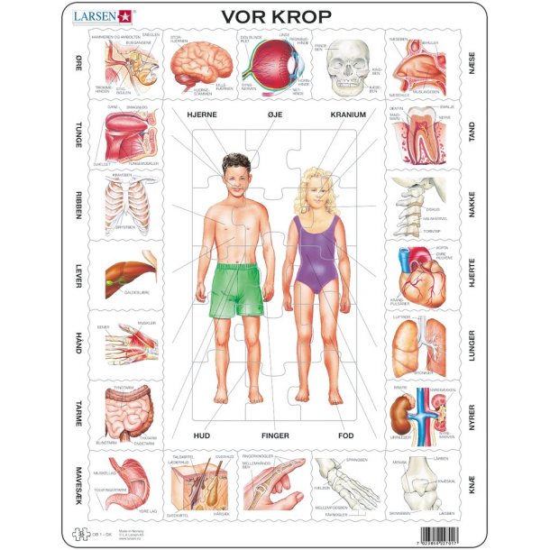 Flot puslespil med fine illustrationer af kroppens organer. Dit barn lærer, hvad de forskellige kropsdele og organer hedder og hvor de hører hjemme i kroppen. Der er en fast indre ramme rundt om brikkerne med de to børn. Indenfor den ydre ramme er der 20 brikker med forskellige kropsdele. Der er i alt 35 brikker.Navnene på kropsdelene står på rammen, og der er en streg fra hver kropsdel til børnenes kroppe. Hver brik med kropsdel passer kun ved det rigtige navn/streg. Størrelse: 36,5 x 28,5 cm