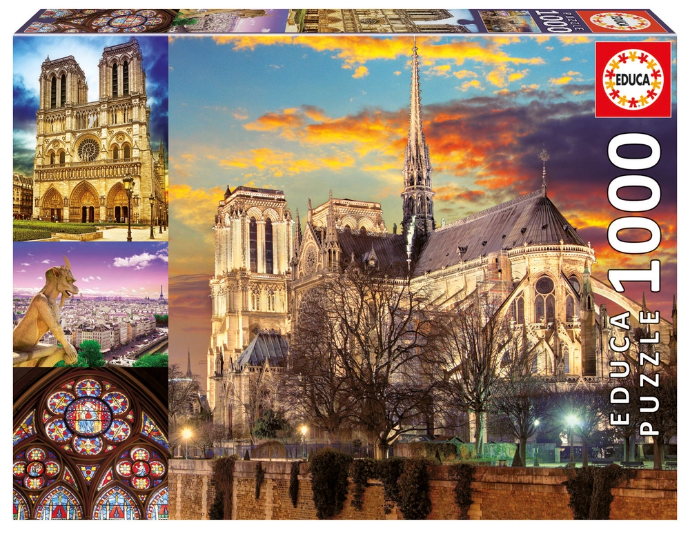 Samlet mål: 68 x 48 cm. Dyk ned i historiens vingesus og arkitektonisk mesterværk med Educa Puslespil Notre Dame collage på 1000 brikker. Dette puslespil er en hyldest til en af verdens mest berømte katedraler, og det giver dig mulighed for at genskabe d