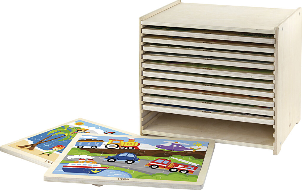 Puslespilsreol I Træ Med 12 Træpuslespil - 12x16 Brikker - Viga