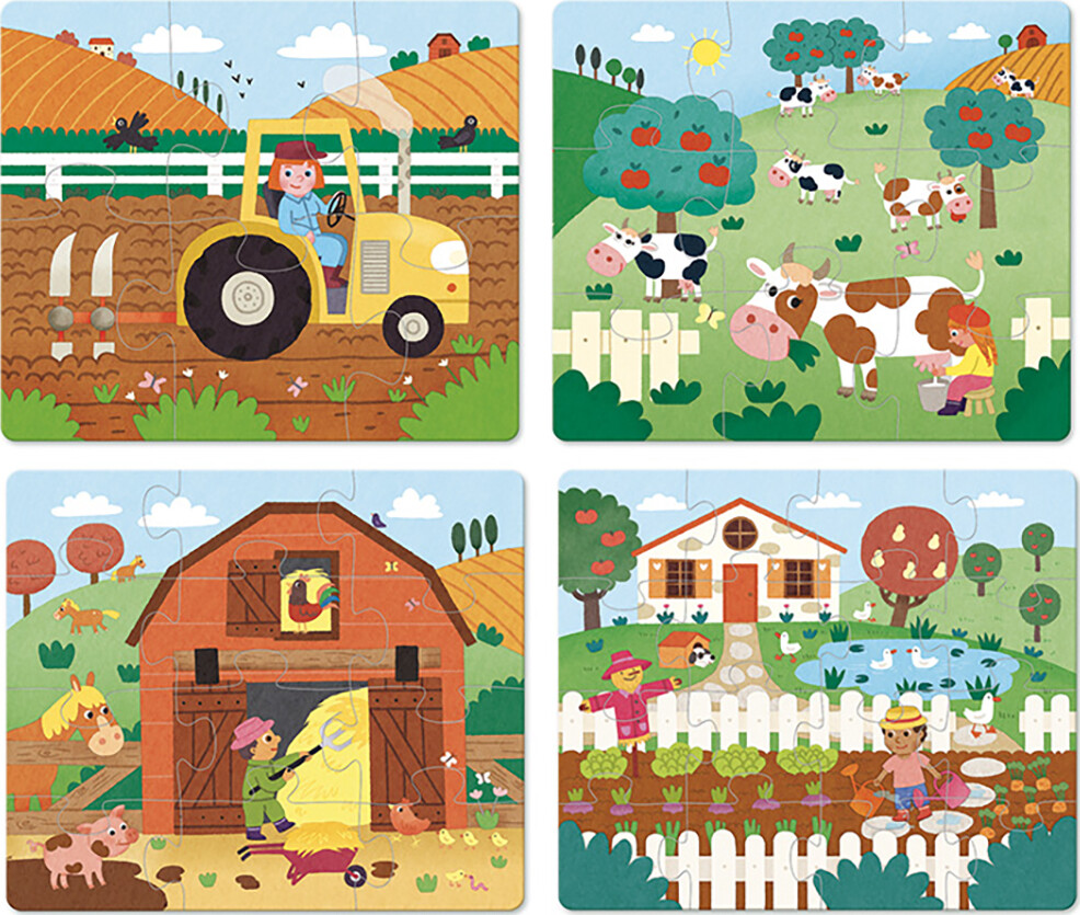 • Fire forskellige puslespil med smukke illustrationer af bondegårdsmiljøet.