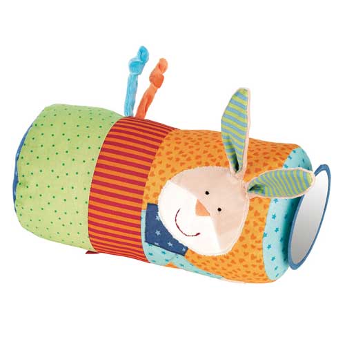 Vi er ret vilde med det søde design, og de mange muligheder denne pude byder på. Dit lille barn kan let kravle efter den, fordi den kun triller én vej og ikke overalt som en bold.Derudover byder den på en masse overraskelser for den mere stille sidende leg, de søde lange  kaninører knitre, det lille runde spejl i enden byder på lang tids sjov og hvor kommer raslelyden nu fra?Kan også bruges som støttepude i forskellige situationer.Farverne er bevidst valgt som farvestrålende og indbydende til leg for små børn Materiale: yderst, bomuld og polyester. Inderst, polyestervatMål: 30 x 15 x15 cm