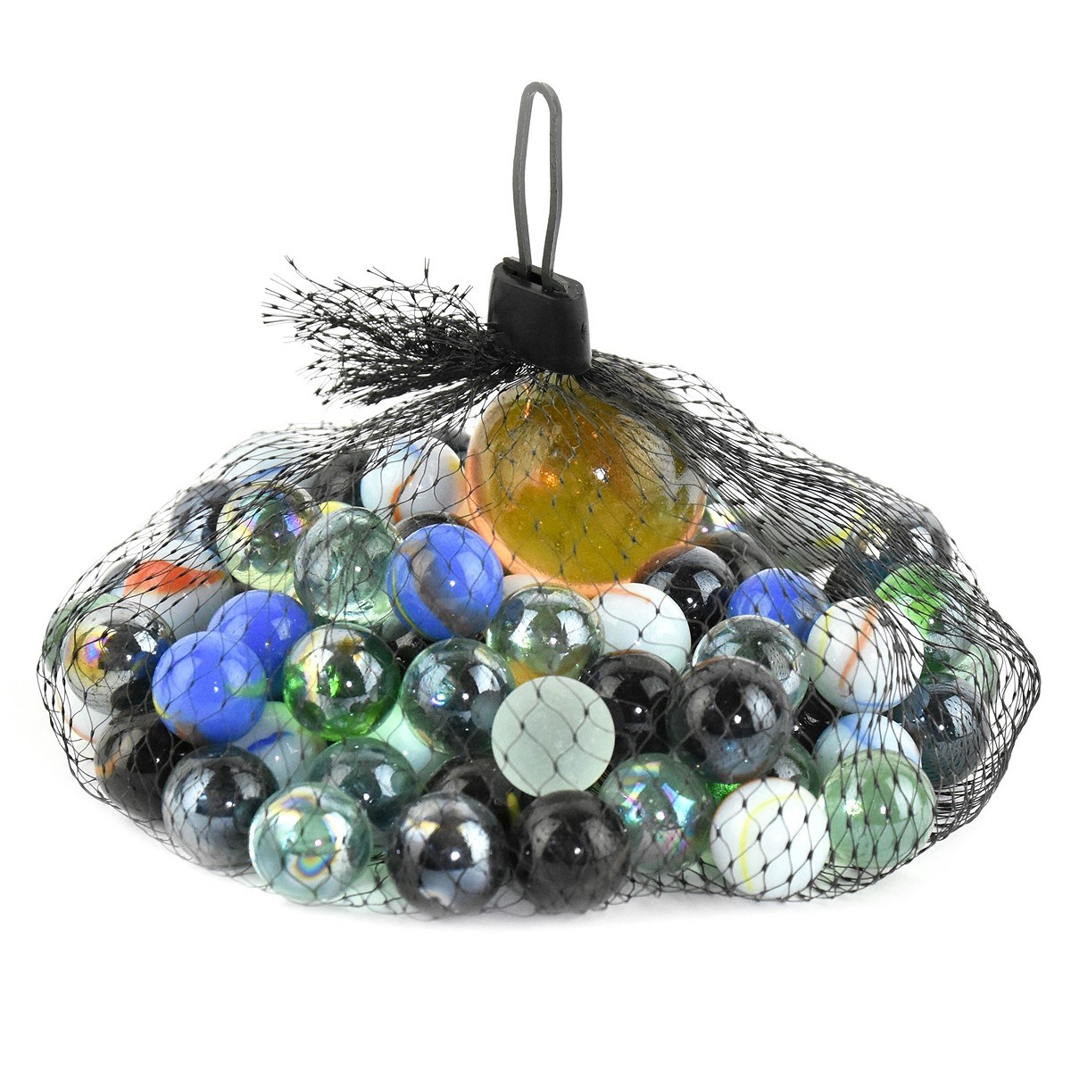 Her får dit barn en hel samling glaskugler. Der er cirka 90-95 kugler, som måler cirka 1,5 cm. Den ene er lidt større, som du kan se på billedet.