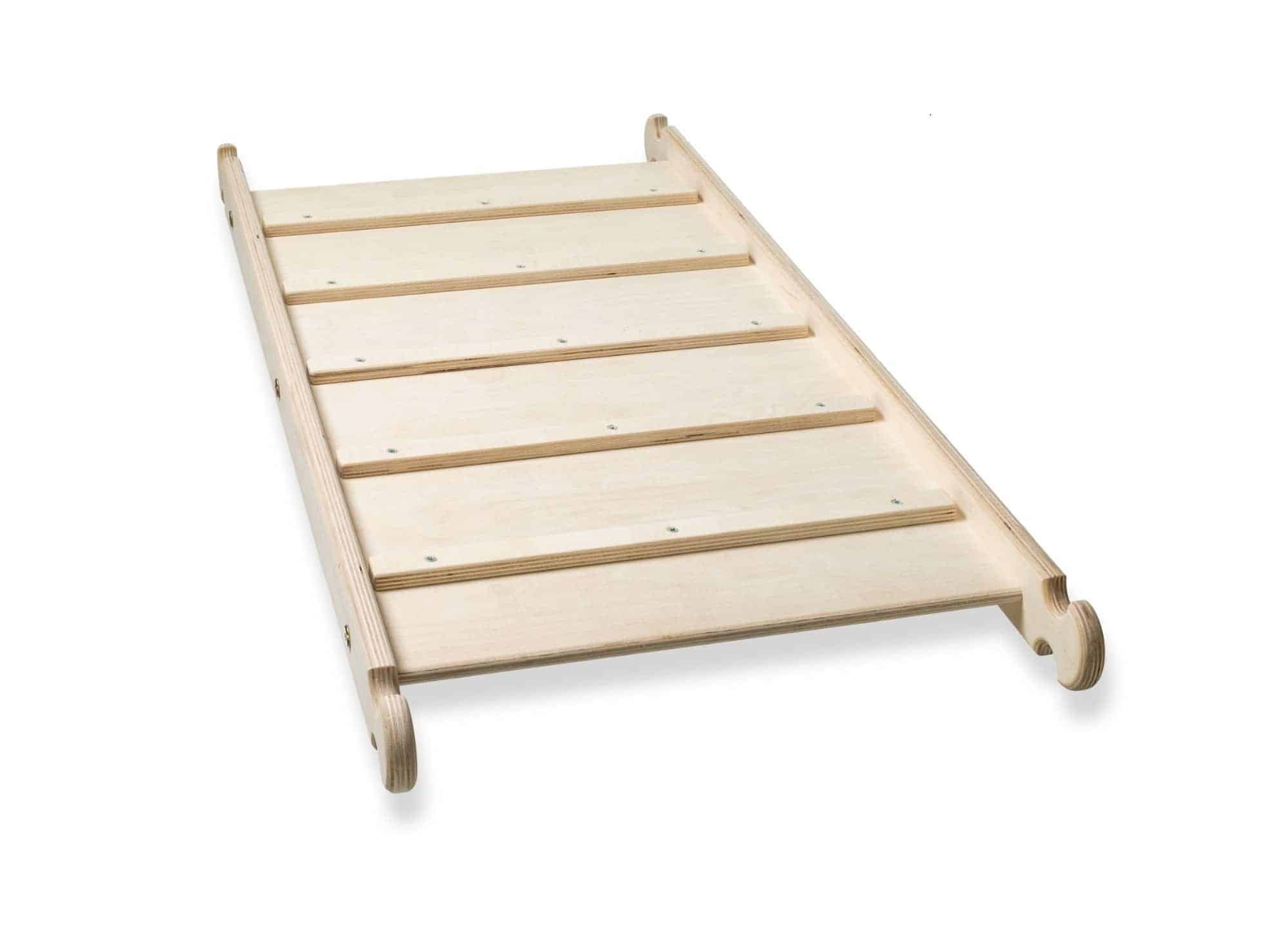 Denne plade har to sider, og den kan nemt sættes på trinene på klatretrekanten og klatrevippen fra Kletterling. Den ene side har en hønsestige med små trin, og den anden er helt glat, så dit barn kan få sig en rutchetur.