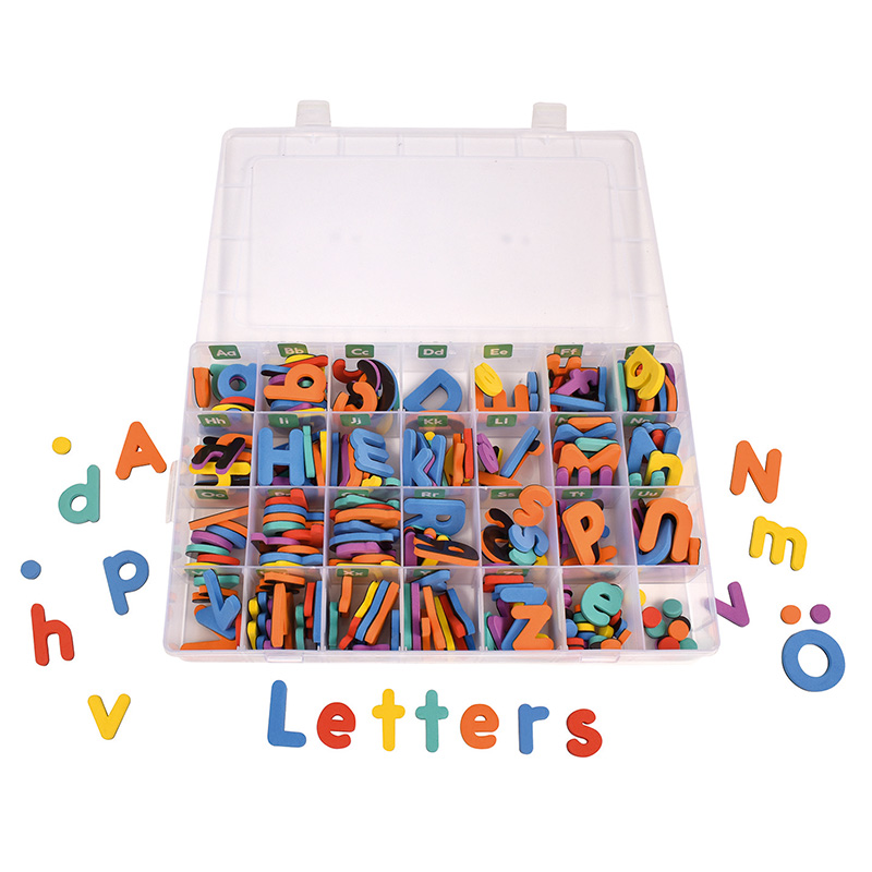 Fine, kulørte bogstaver som er magnetiske så de kan hænge på køleskabet, whiteboardet eller en anden magnettavle. 288 styks fra A-Z så der er flere af hvert bogstav, så også Anna og Ebbe kan skrive sit navn uden at mangle bogstaver. Både store og små bogstaver, så dit barn kan øve sig på, hvordan begge dele ser ud. Af EVA som er blød at røre ved. Måske kender du det fra bObles. Leveres i praktisk gennemsigtig opbevaringsboks.Æsken måler 34 x 22 cm.