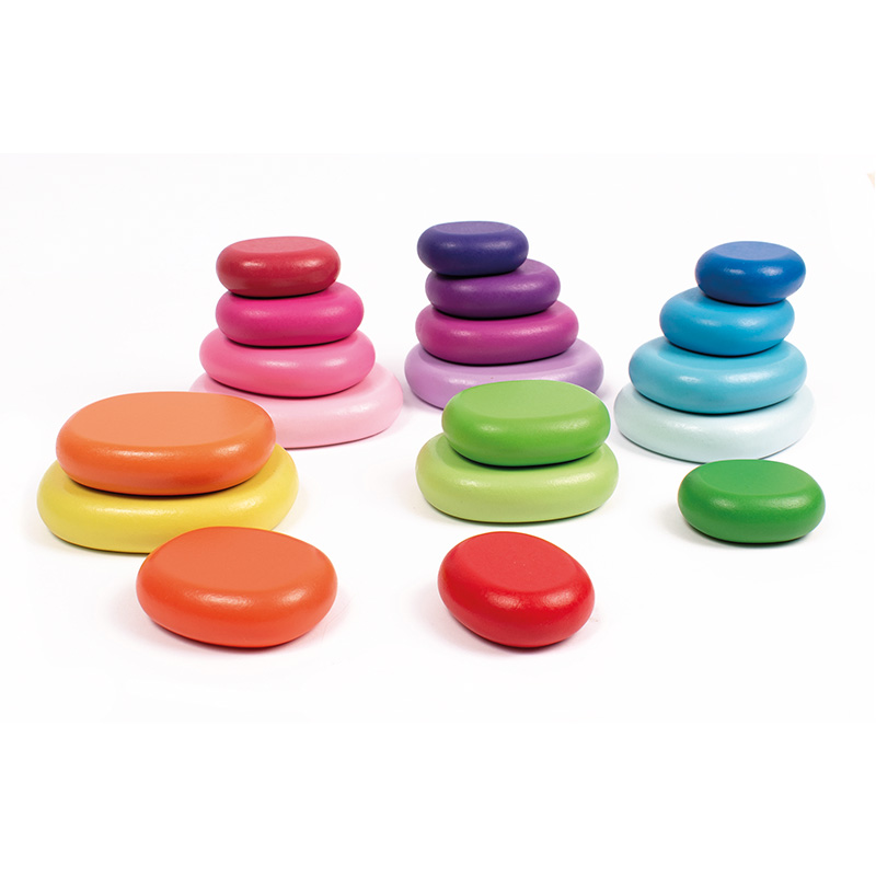20 glatte stablesten af træ som inviterer dit barn til intuitiv leg. Der er ingen regler for, om dit barn bruger stenene til at trille med, farvesortere eller stable tårne med de mindste øverst - eller nederst for at se, hvordan det går. Du kan også bruge de flotte sten til tællelege og når dit barn skal lære om mængder, flere, færre og halvt eller dobbelt så mange.4 forskellige størrelser (fra 4 til 7,5 cm) i flotte regnbuefarver.