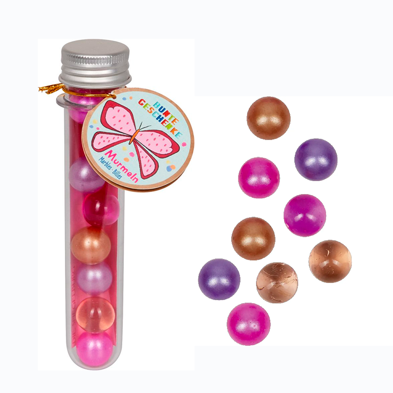 Fine glaskugler i et praktisk rør med låg, hvilket gør dem nemme at transportere. Hver kugle måler cirka 1,6 cm og er ikke blot en visuel fornøjelse, men også underholdende at lege med. Disse glaskugler kan desuden anvendes i udvalgte kuglebaner, hvilket øger legemulighederne.