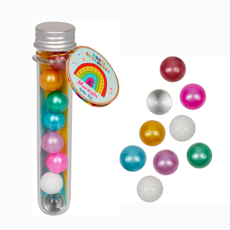 Glaskugler har fascineret børn i generationer. Her er 9 fine glaskugler som er inspireret af regnbuens farver og som dit barn kan trille med, lege med og nulre i lommen, når de ikke ligger i det praktiske rør.Hver kugle er cirka 1,6 cm og reagensrøret (af plast) er cirka 3 cm i diameter.
