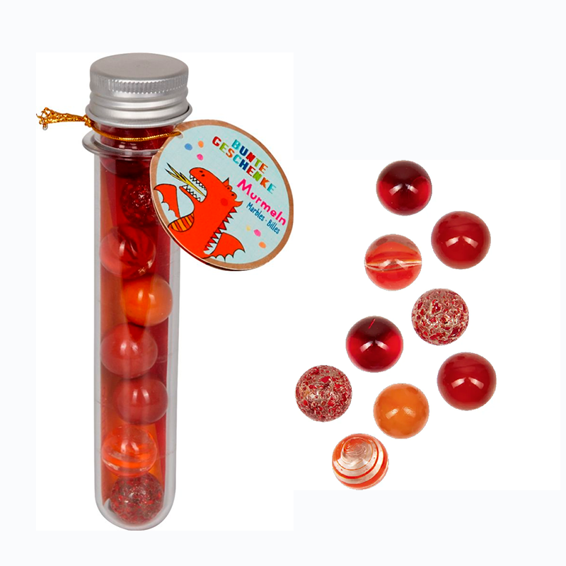 Glaskugler har fascineret børn i generation efter generation. Her er 9 dragende (høhø) glaskugler som dit barn kan trille med, lege med og nulre i lommen, når de ikke ligger i det praktiske rør.Hver kugle er cirka 1,6 cm og reagensrøret (af plast) er cirka 3 cm i diameter.