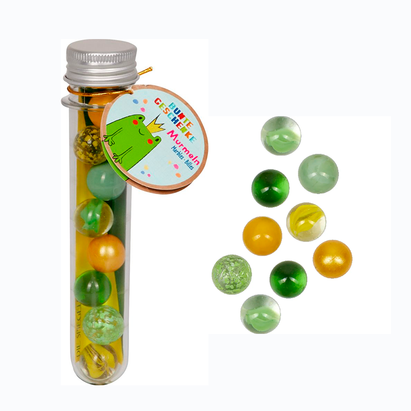 Glaskugler har været en kilde til glæde og leg for børn i mange år. Med dette sæt af 9 fine grøn-gule glaskugler kan dit barn nyde timevis af underholdning. Hver kugle måler cirka 1,6 cm, og de leveres i et praktisk reagensrør af plast, som har en diameter på cirka 3 cm. Dette gør dem nemme at opbevare og transportere.