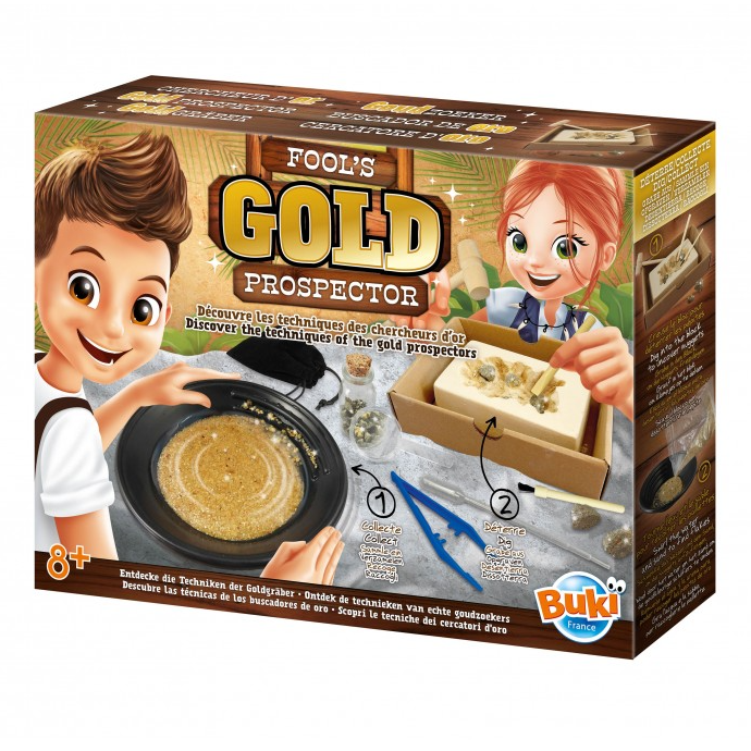 Grav guld frem og lær at tænke som en vaskeægte guldgraverMed dette sæt kan dit barn gå på opdagelse som guldgraver. Grav i gips, vask sand og find sten og skinnende guldklumper i form af svovlkis, der ligner guld og kaldes fools gold. Alt udstyret er med, og det hele minder om, hvordan det foregik, da tusindvis af mennesker strømmede mod guldårene i Californien og Canada.Dit barn lærer at bruge en pan (guldvaskepande), pincet, lup og hammer, og kan følge instruktionerne til både udgravning og guldvask. Her får dit barn en konkret fornemmelse for, hvordan man leder efter ædelmetaller i naturen og hvordan narreguld kan snyde selv de mest håbefulde gravere.Gipsklodsen graves fri med værktøjet, og sandet bruges til at vaske de små klumper frem. Det hele kan gentages, da man får sand nok til to omgange.Indeholder:GuldvaskepandeLup og pincetGipsblok med skjulte stenSandpose til guldvaskHammer og mejselBørstePipette og forstøverLille flaske og opbevaringspose