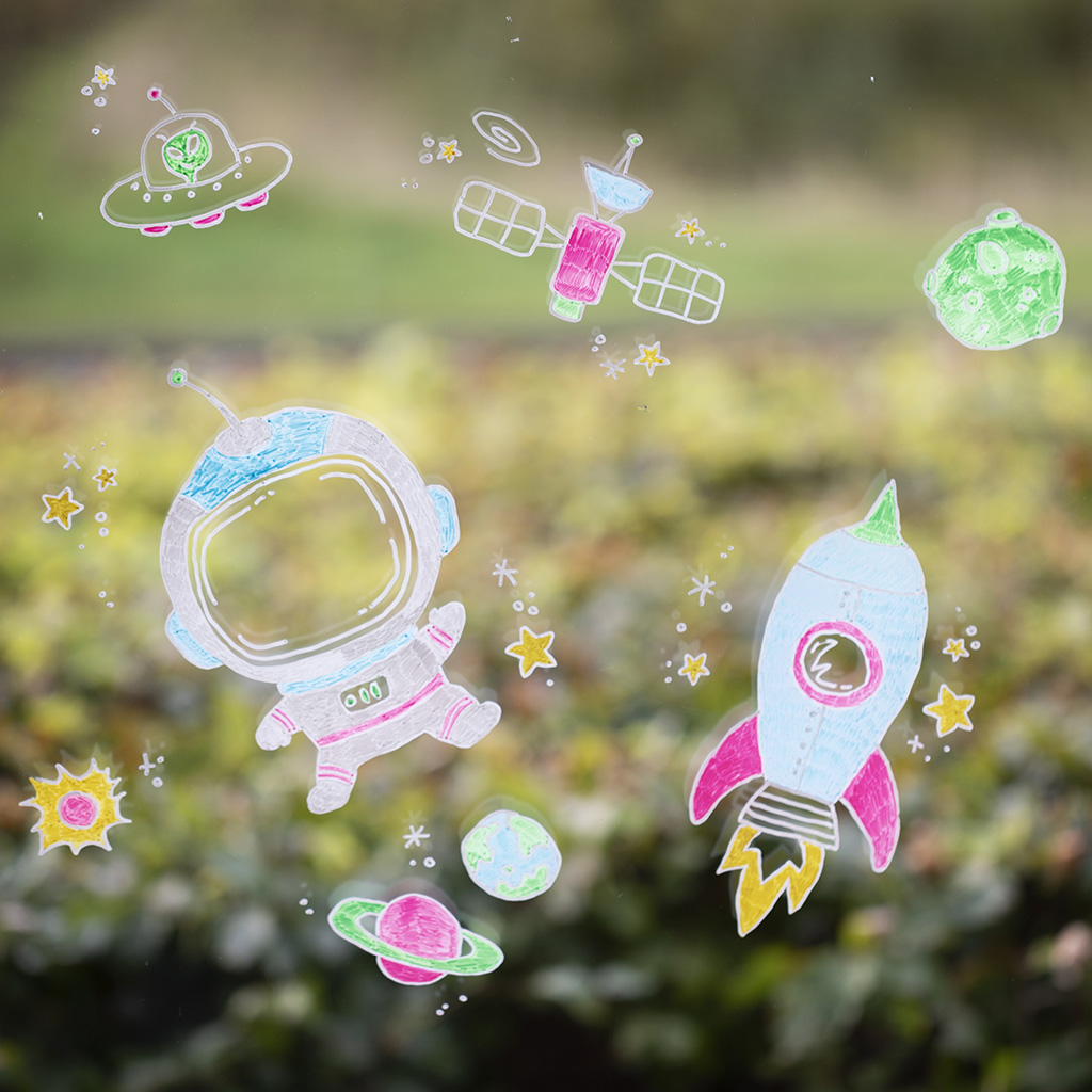 Man må gerne tegne på vinduerne! Med kridttusser, altså. De kan nemlig vaskes af med en fugtig klud og eventuelt lidt sæbe.Køb disse 5 flotte pastel-farvede kridttusser og brug de skabeloner, du kan downloade kvit og frit ved at trykke på knappen her til højre på siden, så kan I dekorere vinduerne som udsigten fra den Internationale Rumstation ISS. Det er et overskueligt og lettilgængeligt kreativt indslag på en helt almindelig dag, hvor både begyndere og mere øvede tegnere kan være med. Nævn lige for dit kreative barn, at det kun er kridttusser, man må tegne på vinduerne med, ikke?Skulle uheldet være ude, så husk også, at husholdningssprit tager de fleste andre former for tus på glas.