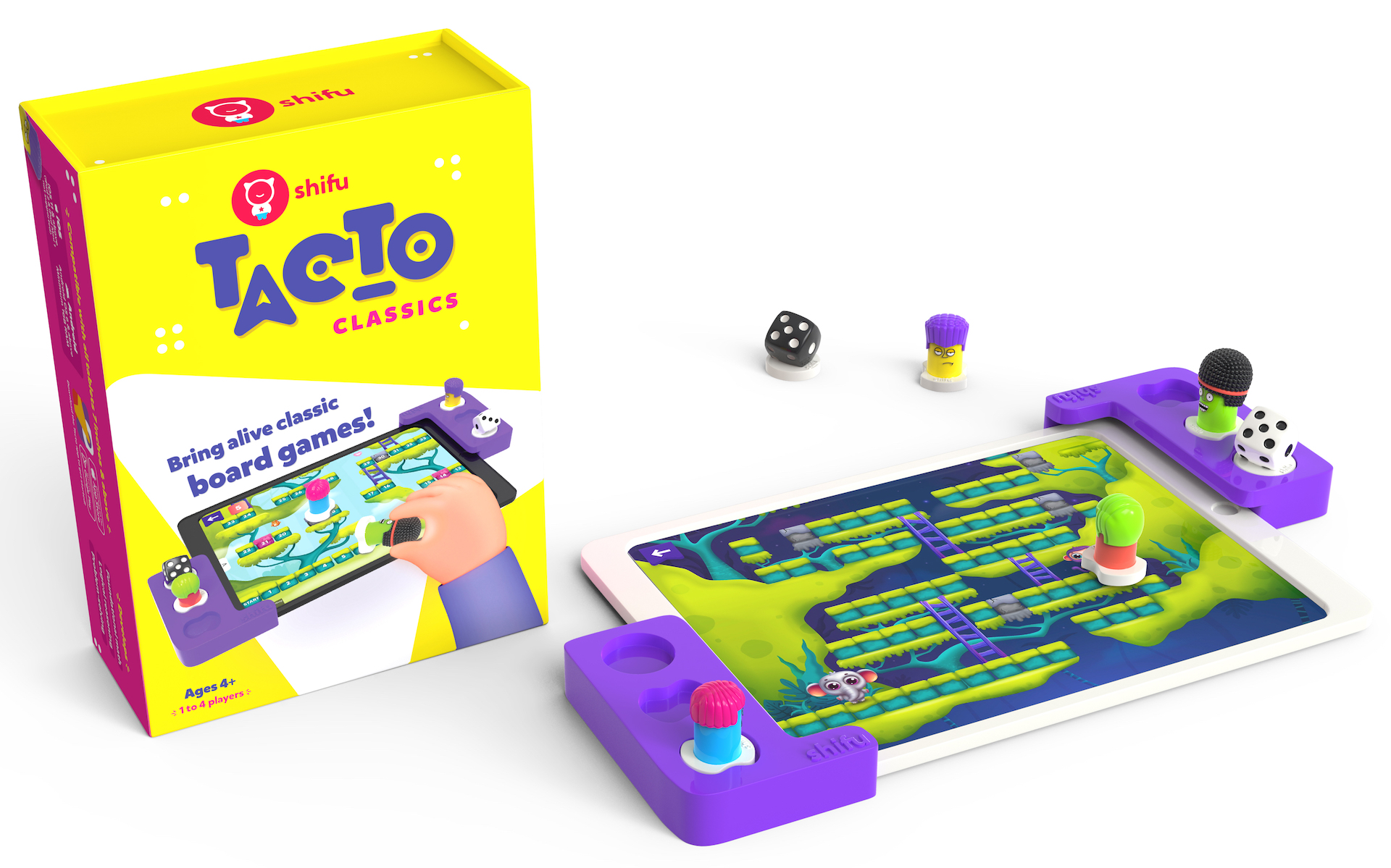 Brætspil er en favorit i mange familier. Opgraderer du de klassiske brætspil med et drys teknologi på begynder-niveau, vil både børn og bedsteforældre få en sjov oplevelse med at spille Ludo, Kryds og bolle, Slanger og Stiger og Dam på en ny måde. Øv jer i at tælle, i simple regnestykker, i at vente på tur, i logik, i engelske ord og i at have det top sjovt sammen, mens I lærer mere om sammenhængen mellem teknologi og virkelighed.Mange børn er fascinerede af skærme og IT, og der er ingen tvivl om, at det at mestre interaktiv teknologi er en arbejdsform, som i dag er en vigtig kompetence i forhold til at lære nyt. Derfor er vi i Legeakademiet begejstrede, hver gang vi kan præsentere en ny form for AR-legetøj i vores webshop. AR står for Augmentet Reality. En oplevelse, der forstørres og gøres mere levende og flerdimensionel ved hjælp af teknologi.Der er figurer og spilleudstyr i hver pakke, så I kan styre spillets gang ved at flytte rundt på figurerne på skærmen. App'en opfatter figurernes bevægelser og forandrer så spillets gang, figurernes bevægelser og laver nye udfordringer, alt efter hvordan I vælger at spille med jeres fysiske figurer. Der findes flere forskellige varianter af Tacto, og hver variant har sine egne figurer. Når I spiller Tacto, kan I vælge dit barns niveau, og efterhånden som I spiller stiger sværhedsgraden. Der er hundredvis af forskellige baner i hver pakke Tacto, så det er ikke et spil, I lige gennemfører på 30 minutter, selvom det er meget enkelt til at starte med.Tacto fungerer sådan, at du:1: Sætter de 2 rammer, du finder i kassen, på hjørnerne af din tablet2: Downloader den gratis app, der hører til Shifu Tacto i enten Google Play eller App Store og vælger den Tacto-pakke, du har købt3: Laver en profil til dit barn eller dine børn og registrerer deres niveau, så spillet fremover tilpasser sig den rigtige sværhedsgrad. I kan også spille uden profiler.4: Vælger evt. figurer, og så starter spillet.Alt efter hvilket Tactospil I spiller, kan I øve jer i at tælle, enkle regnestykker, strategi og taktik, det at vente på tur, sekvenser og kodning samt logik. Se også de andre Tacto-varianter og resten af vores fine udvalg af AR-spil fra Shifu. Brug søgefunktionen i toppen af vores webshop. Du kan også finde de andre AR-spil fra Shifu her.Tacto er på engelsk og har en del forklaringer i starten samt en del engelsk tale undervejs, som gør spillet til en mere levende og sjov oplevelse. Det er bedst, at der er en voksen til at hjælpe. Når spillet er i gang, er det meget intuitivt og nemt at spille, selvom dit barn ikke er stærk i engelsk. Tacto Classics er udviklet til børn fra 4 år, og hvis dit barn har almindelige sproglige kundskaber, vil vi anbefale Classics fra 7 år. Har dit barn gode engelsk-kundskaber, kan I sagtens spille før. I æsken finder du: 4 figurer2 terninge-figurer2 rammerOp til 4 spillere.Tacto kan anvendes med følgende devices: IOS: iPad 5 og nyere. (iPad mini 1 og iPad 2 understøttes ikke.) Android: Version 5 og nyere.Android tablets: 7 inch og mere, minimum 2 GB RAM. (Samsung Tab A,S5e og S7+ understøttes ikke)Amazon Fire: HD 10 (2021). (Fire 7 understøttes ikke).