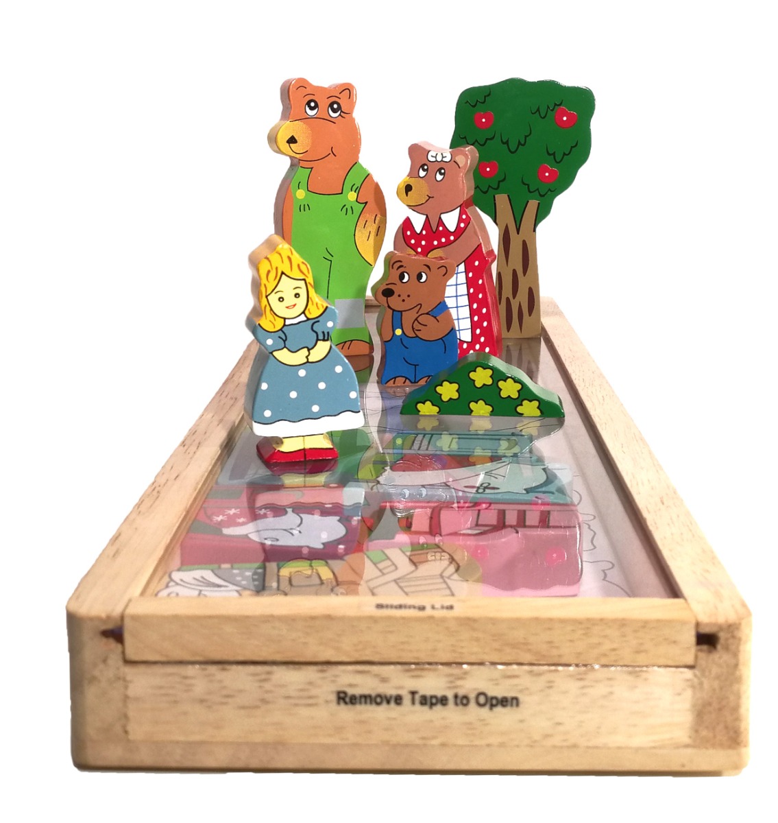 Hvis du gerne vil tryllebinde børn og samtidig udvikle deres selvforståelse og dialogiske evner, så er et bordteater en super god vej at gå.Figurerne er solide og dejligt glatte at røre ved, og de er malet med klare farver, der skinner. De står sikkert på højkant og kan derfor bruges både som fortælle-redskaber og som selvstændige figurer i andre lege. Guldlok og de 3 bjørne er et klassisk folkeeventyr, som blev nedskrevet og dermed til en vis grad fastfrosset i en særlig form af Brødrene Grimm. Her er fin mulighed for at tale om at snige sig ind i andres huse, at fare vild, om størrelsesforhold og om at tælle til 3.At fortælle en historie er en aktivitet, som mennesker har til fælles overalt i verden. Vi fortæller faktisk historier om de samme temaer på kryds og tværs af kulturer - og det er en meget vigtig kompetence at kunne forstå og fortælle en historie med start og slutning. Den opøves ved at gøre det igen og igen og gerne tale om det hele undervejs, stille spørgsmål og give historien ens eget præg. Når børn skal tilegne sig forståelse for historier, er fysiske redskaber en stor hjælp. Dette skønne klodssæt giver børn mulighed for at lege med eventyrets handling, og det er også en virkelig god måde at levendegøre selve eventyret, mens det fortælles. På den måde er fortælleren ikke gemt bag en bog, men aktiv og i tæt kontakt med de lyttende børn, som kan blive deltagende børn i stedet for passive børn. Velegnet både derhjemme og i vuggestuer og børnehaver - eller til demente eller mennesker med særlige behov. Måler 40 x 12,5 cm.