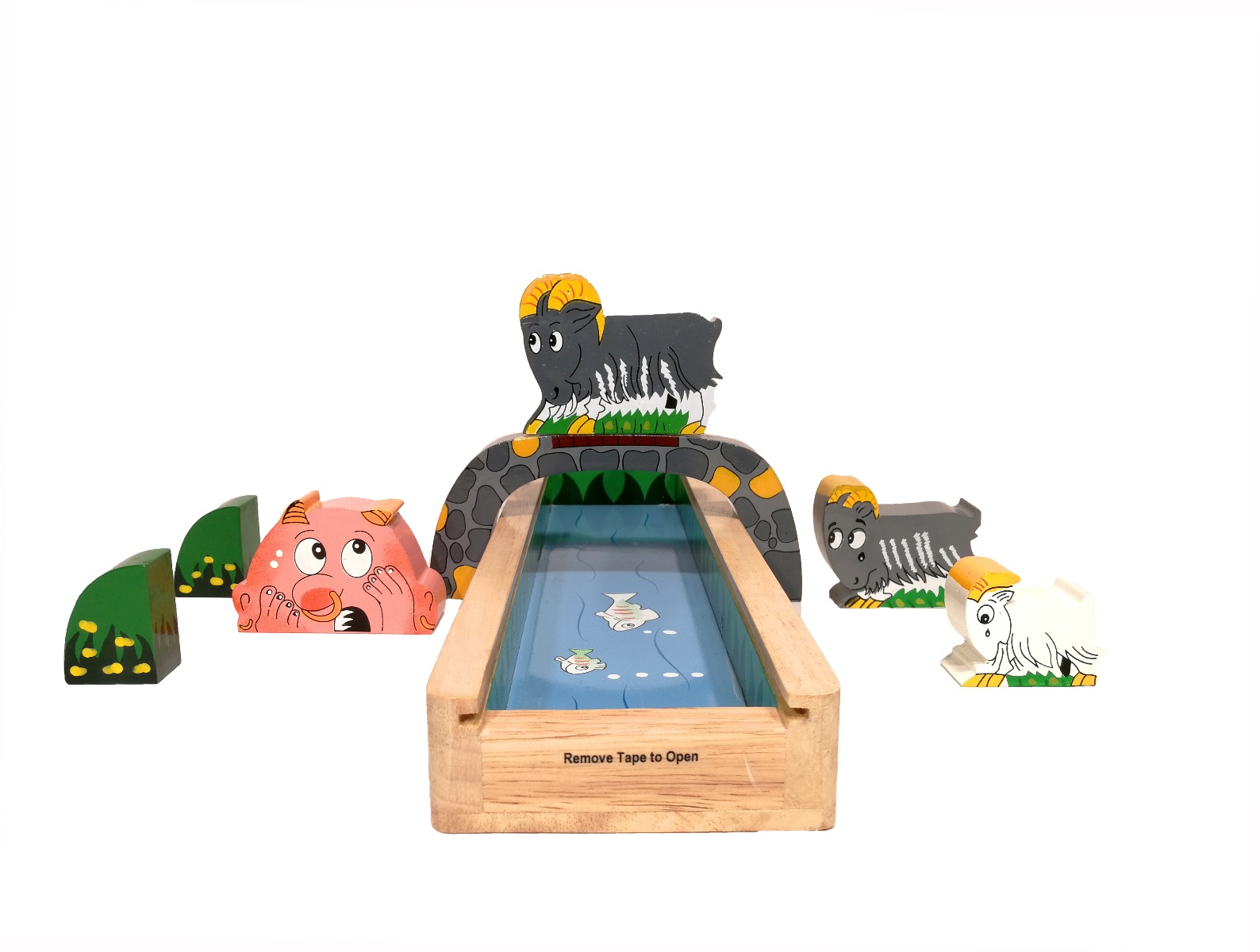Skønne eventyrklodser af træ med blank overflade og flotte farver, som bringer det norske folkeeventyr om De Tre Bukke Bruse til live for børn helt ned til vuggestuealderen og til indskolingen. Eventyret blev nedskrevet tilbage i 1842 og udgivet i en folkemindesamling i 1843 på norsk - men siden er det skønne eventyr om den sultne trold under broen, og de tre bukke bruse, der tramper over på sæteren, blevet genfortalt til børn fra mange kulturer og breddegrader. Der findes faktisk både en indisk og en ungarnsk bukke bruse-historie!Dette fine sæt har klodser formet som broen, trolden, de 3 bukke bruse og en græstot, som skal illustrere sæteren - altså den græseng, hvor de 3 bukke bruse skal over for at spise sig tykke og fede efter en lang vinter og en sulten vår. At fortælle en historie er en aktivitet, som mennesker har til fælles overalt i verden. Vi fortæller faktisk historier om de samme temaer på kryds og tværs af kulturer - og det er en meget vigtig kompetence at kunne forstå og fortælle en historie med start og slutning. Den opøves ved at gøre det igen og igen og gerne tale om det hele undervejs, stille spørgsmål og give historien ens eget præg. Når børn skal tilegne sig forståelse for historier, er fysiske redskaber en stor hjælp. Dette skønne klodssæt giver børn mulighed for at lege med eventyrets handling, og det er også en virkelig god måde at levendegøre selve eventyret, mens det fortælles. På den måde er fortælleren ikke gemt bag en bog, men aktiv og i tæt kontakt med de lyttende børn, som kan blive deltagende børn i stedet for passive børn. Velegnet både derhjemme og i vuggestuer og børnehaver - eller til demente eller mennesker med særlige behov.