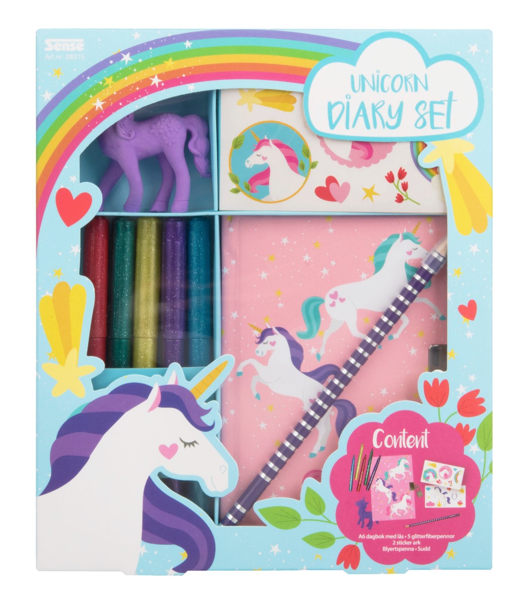 Hemlig nemlig. Fin enhjørningdagbog med lås til alle hem'lighederne.Dagbogen kan pyntes ekstra meget med klistermærker og de fem medfølgende glitterpenne til tegninger, opremsninger med bullets eller til glitrende hjerter ved navnet på den sødeste fra klassen.Desuden får du blyant og enhjørning-viskelæder med i sættet.Oplagt til børn, der er ved at lære at skrive, men også god til de skrivekyndige og til mindre børn. De yngste kan tegne deres hverdag og hemmeligheder og øve sig i at holde på blyant og glimmerpennene.God til at komme af med frustrationer og overvejelser og give rum for ro og fordybelse i en travl hverdag.