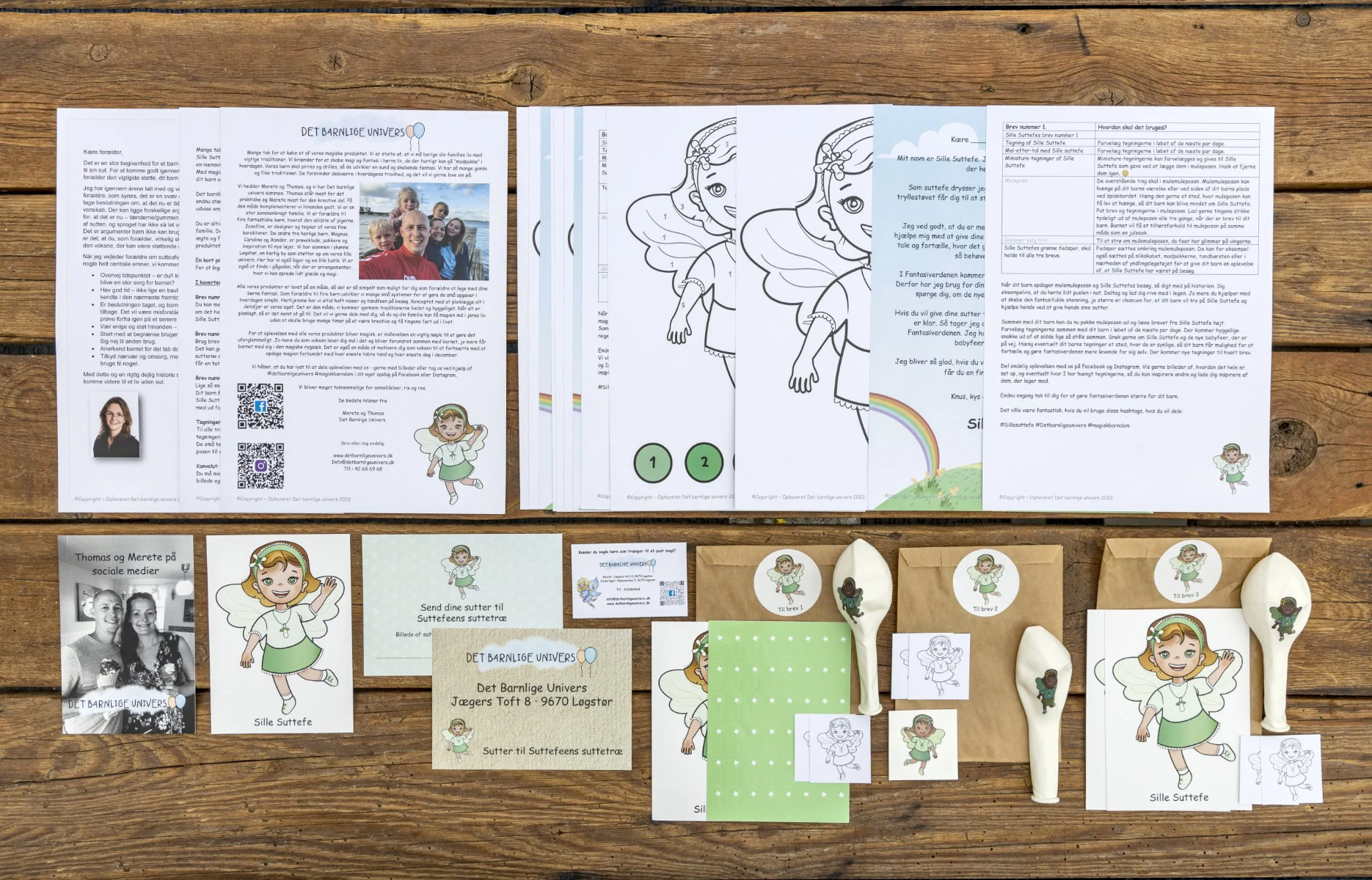 Sutteafvænning er en svær overgang for mange børn, og som forælder til et barn, der virkelig knuselsker sin sut, kan det virke brutalt at tvinge sit barn til at sige farvel til den. Men det skal jo ske på et tidspunkt.Den lille suttefe hjælpepakke til familie er en hjælpende hånd til dig som forælder.Sille Suttefe er skabt for at hjælpe dit barn med at vænne sig af med at bruge sut. Med magisk hjælp fra Sille Suttefe bliver det forhåbentlig til en god oplevelse for dit barn.For at lege med, skal du finde en mulepose eller lignende til at have tingene fra suttefeen i. Hvis du i stedet vælger den store pakke, får du også et lækkert net med Sille Suttefe.Indhold: Tre breve fra Sille Suttefe til dit barn, tre tegninger af Sille Suttefe, tre farvelæg efter tal Sille Suttefe, tre miniature tegninger på 4×5 cm, en børnetatovering med Sille Suttefe, et A6 ark med suttefe fodspor klistermærker, tre postkort af Sille Suttefe, bionedbrydelig ballon med Sille Suttefe.I kuverten er der til tre breve fra Sille Suttefe. Før du hænger muleposen med breve frem, kan du nogle dage før begynde at nævne Sille Suttefe. Det vil gøre det hele nemmere for dit barn, hvis det kender lidt til Sille Suttefe.Brev nummer 1:Her ankommer suttefeen Sille til dit barns hjem. Hun fortæller, at hun virkelig mangler sutter, fordi der snart kommer nye babyfeer og alfer i Fantasiverdenen. Hun spørger, om dit barn måske vil af med sutterne?Brev nummer 2:Brug brevet, når du og dit barn er klar til det næste skridt at aflevere sutterne til Sille Suttefe. Det skal være et par dage før suttestop, men helst ikke længere end det. Spørg dit barn, om sutterne snart kan sendes til Sille Suttefe, da hun virkelig mangler dem nu til babyfeerne. Dit barn får en tatovering som motivation.Brev nummer 3:Lige så snart sutterne er i muleposen, kan du snige dig ind for at gøre muleposen klar til dit barn igen. Dit barn får et fint takkebrev fra Sille Suttefe. Der skal lægges en lille gave frem til dit barn fra Sille Suttefe. Det skal være en ny sød eller sej bamse. Det kan også være, at du vil have dit barn med ud for at købe legetøj. men der skal en lille bamse fra Sille Suttefe.Tegninger:Til alle tre breve er der tegninger af Sille Suttefe, så du sammen med dit barn kan farvelægge tegningerne. Det hjælper dit barn med at lære Sille Suttefe at kende og blive tryg ved hende.De små tegninger kan dit barn eventuelt give til Sille Suttefe. Det gør dit barn ved at putte dem i posen til suttefeen. Husk at fjerne dem igen.Konvolut:Du må meget gerne sende dit barns sutter til Det barnlige univers, som har produceret varen. Så hænger de dem på deres fine suttetræ, tager et billede og sender det til din mail. Husk at skrive mailadressen på kuverten.