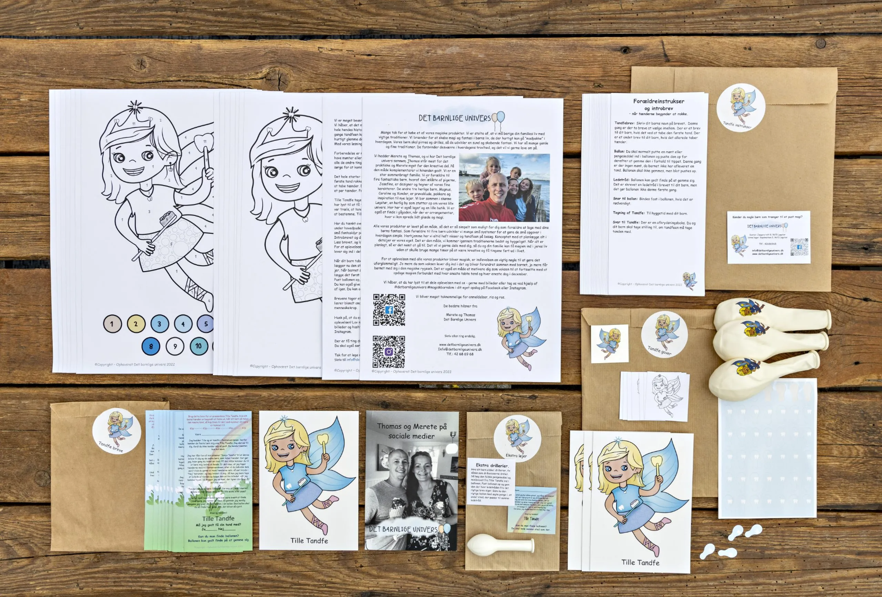 Tille Tandfe og hele hendes historie er lavet med tanke på at holde magien levende, når barnet taber sine tænder. De første gange tandfeen kommer på besøg, er det rigtig stort for børn og voksne. Men efter de første tænder kan man hurtigt glemme det og komme ud i undskyldninger som Tandfeen var blevet syg, eller måske farede hun vild. Her har du en komplet pakke, som gør det ekstra magisk for dit barn at tabe de første 10 tænder.Det hele starter med et introbrev. Det skal du læse for dit barn, fx når den første tand rokker. Det er helt valgfrit, hvornår tandfeen fortæller, at hun glæder sig til, at barnet begynder at tabe tænder. Der er to varianter af brevet i posen, så der også er et brev til dig, hvis barn allerede har tabt et par tænder.Tille Tandfe tager ikke nødvendigvis tænderne med. Måske er dit barn rigtigt stolt af og glade for sine tabte tænder. Måske er det træls, at tandfeen får dem, inden mormor og morfar ser dem. Tille Tandfe kan også tage et billede af tanden og lægge den i tandbeholderen efterfølgende, så I kan beholde den.Når dit barn taber sin første tand, sker der løjer.Dit barn lægger nu tandbeholder under hovedpuden, ved tandfehuset, eller hvor det giver bedst mening for jer. Når barnet sover, så lister tandfeens hjælper (som jo er dig), ind og tager tanden ud af beholderen for at lægge det første søde brev til barnet. Brevene fortæller om tandfeen, om hvor hun bor, hvad hun bruger tænderne til. Hun opfordre også til at passe godt på tænderne og lade de voksne børste tænderne også.Når du har taget tanden, så kan den lægges i tandbeholderen, eller gemmes væk, alt efter hvad I synes.I brevet står der en ledetråd til dit barn.Pust ballonen op, og gem den med tanke på ledetråden fra brevet, der er ideer til steder i instukserne. Når dit barn så vågner, er der en lille fin hilsen fra tandfeen, og så skal dit barn ud i hjemme og lede efter mønten eller sedlen.Der er gaver til barnet frem til tand nummer 10. Herefter er dit barn blevet så stort og synes måske ikke, det er helt så magisk længere. Brevene har nu taget en drejning, da de handler mere om sjove ting og fakta om tænderne. De lærer blandt andet om tandbørstning, om at en tand kan dø, og om at emaljen er den hårdeste del på en menneskekrop.Der er også en lille hilsen, hvis I skulle glemme at få taget tanden inden barnet vågner, så har tandfeen bare haft så travlt.Indeholder: Breve og instrukser til alle 20 mælketænder, tandfe fodspor, tatovering med tandfe, 3 ballone rmed tandfeen, 3 postkort med tandfeen. 7 x tegning A4 af tandfeen, 7 x mal efter tal A4 med tandfeen, 12 miniature tegninger af tandfeen.Der er også ekstra løjer, som indeholder en mini pengeseddel, en ballon og en lille hilsen om, at hun også kan lide at drille.