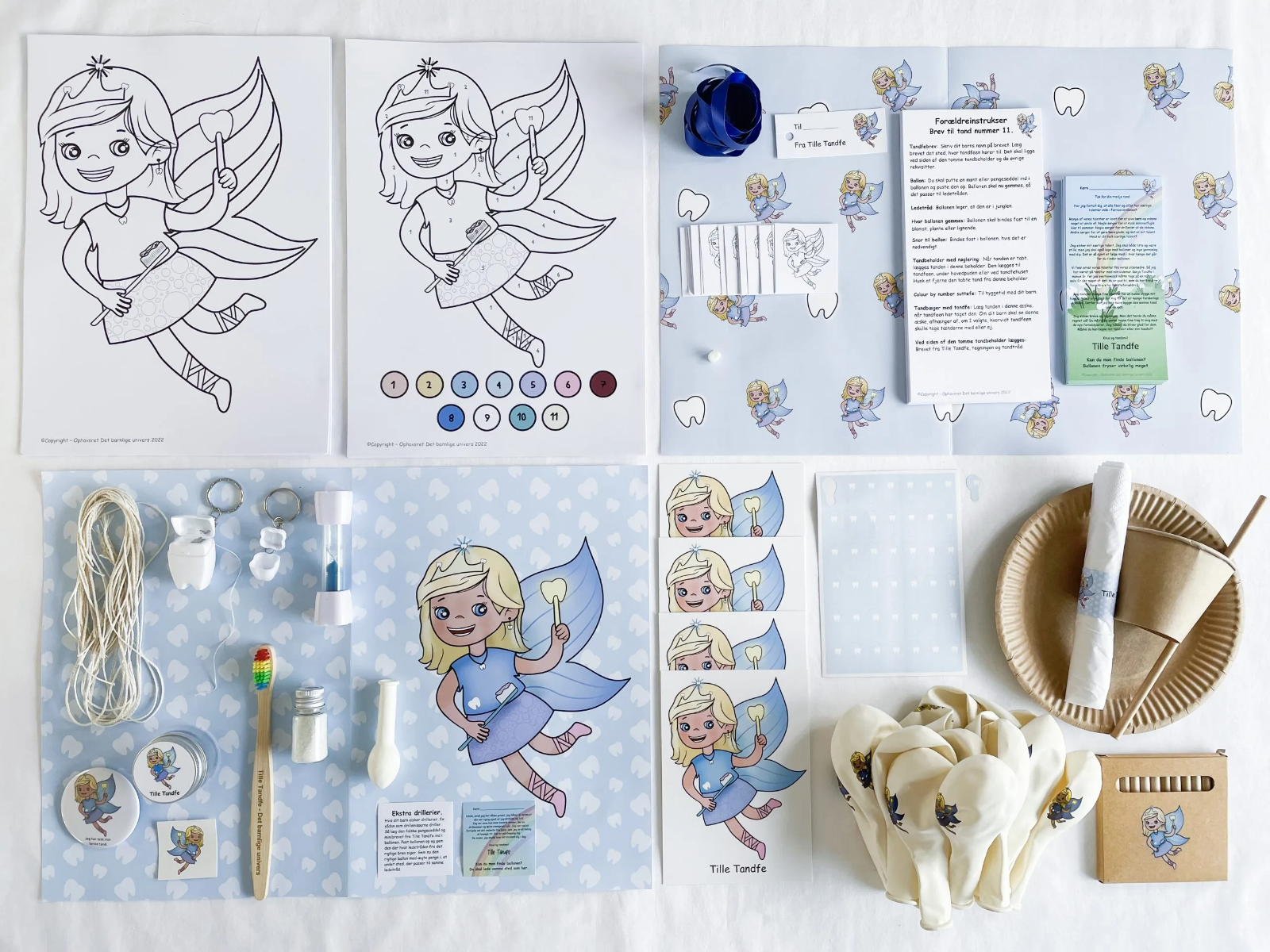Tille Tandfe og hele hendes historie er lavet med tanke på at holde magien levende, når barnet taber sine tænder. De første gange tandfeen kommer på besøg, er det rigtig stort for børn og voksne. Men efter de første tænder kan man hurtigt glemme det og komme ud i undskyldninger som Tandfeen var blevet syg, eller måske farede hun vild. Her har du en komplet pakke, som gør det ekstra magisk for dit barn at tabe de første 10 tænder.Det hele starter med et introbrev. Det skal du læse for dit barn, fx når den første tand rokker. Det er helt valgfrit, hvornår tandfeen fortæller, at hun glæder sig til, at barnet begynder at tabe tænder. Der er to varianter af brevet i posen, så der også er et brev til dig, hvis barn allerede har tabt et par tænder.Tille Tandfe tager ikke nødvendigvis tænderne med. Måske er dit barn rigtigt stolt af og glade for sine tabte tænder. Måske er det træls, at tandfeen får dem, inden mormor og morfar ser dem. Tille Tandfe kan også tage et billede af tanden og lægge den i tandbeholderen efterfølgende, så I kan beholde den.Når dit barn taber sin første tand, sker der løjer.Dit barn lægger nu tandbeholder under hovedpuden, ved tandfehuset, eller hvor det giver bedst mening for jer. Når barnet sover, så lister tandfeens hjælper (som jo er dig), ind og tager tanden ud af beholderen for at lægge det første søde brev til barnet. Brevene fortæller om tandfeen, om hvor hun bor, hvad hun bruger tænderne til. Hun opfordre også til at passe godt på tænderne og lade de voksne børste tænderne også.Når du har taget tanden, så kan den lægges i tandbeholderen, eller gemmes væk, alt efter hvad I synes.I brevet står der en ledetråd til dit barn.Pust ballonen op, og gem den med tanke på ledetråden fra brevet, der er ideer til steder i instukserne. Når dit barn så vågner, er der en lille fin hilsen fra tandfeen, og så skal dit barn ud i hjemme og lede efter mønten eller sedlen.Der er gaver til barnet frem til tand nummer 10. Herefter er dit barn blevet så stort og synes måske ikke, det er helt så magisk længere. Brevene har nu taget en drejning, da de handler mere om sjove ting og fakta om tænderne. De lærer blandt andet om tandbørstning, om at en tand kan dø, og om at emaljen er den hårdeste del på en menneskekrop.Der er også en lille hilsen, hvis I skulle glemme at få taget tanden inden barnet vågner, så har tandfeen bare haft så travlt.Indeholder: Breve og instrukser til alle 20 mælketænder, tandfe fodspor, tatovering med tandfe, 20 balloner med tandfeen, bambus tandbørste med Tille Tandfe skrevet på, nøglering til den tabte tand, nøglering med tandtråd, emblem Tandfeen har fået min første tand, 3 postkort med tandfeen, 7 x tegning A4 af tandfeen, 7 x mal efter tal A4 med tandfeen, 12 miniature tegninger af tandfeen.Der er også ekstra løjer, som indeholder en mini pengeseddel, en ballon og en lille hilsen om, at hun også kan lide at drille.