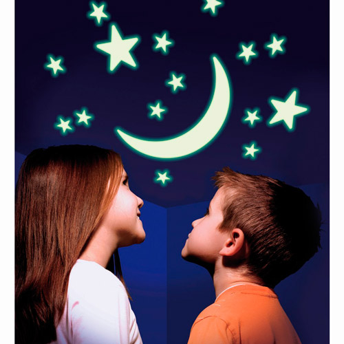 Dekorer loftet eller væggen med dette skønne sæt, og se det lyse op når lyset slukkes og rummet bliver mørkt. De skal bare have suget lys til sig inden.Sæt halvmånen op, og se I kan finde et stjernebillede som I kan sætte stjernerne op efter, hvad med f.eks. dit barns stjernetegn.Stjernerne er i forskellige størrelser.Sættet består af:1 halvmåne - 12 cm15 stjernerKlæbepuder