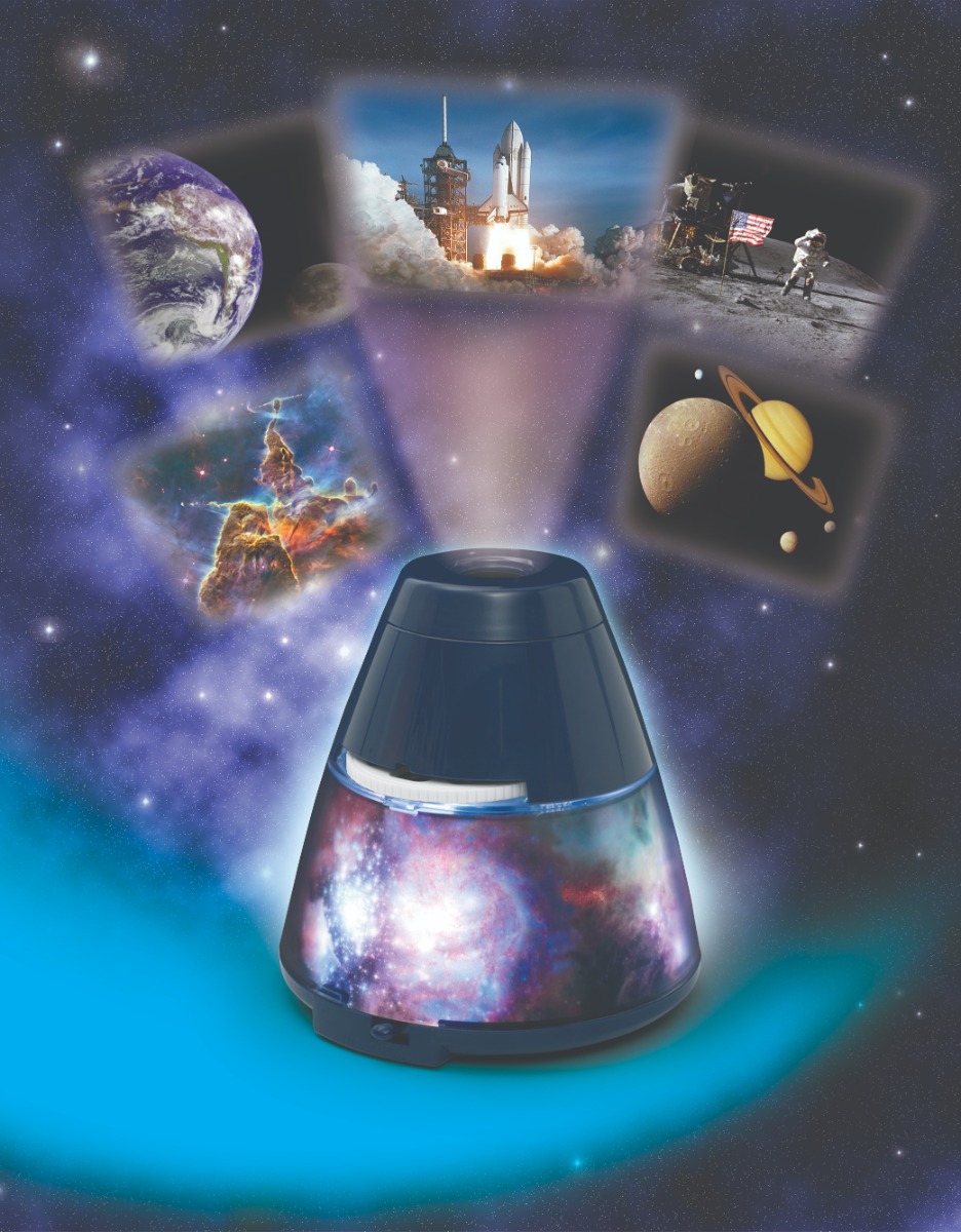 Sej projektor eller vågelys, som kan stå fremme på bordet. Vælg mellem to funktioner: Se 24 smukke fotos af rummet, rumstationen og himmellegemer, fotograferet af Hubble teleskopet - i projektoren bliver de op til 1 meter brede, når de kastes op på loftet. Eller lad den være en lampe, der viser smukke stjernetåger. Det er nemt at skifte mellem de to funktioner med knappen. Fascinerende indblik i astronomi og rumrejser, som stimulerer interessen for rummet.