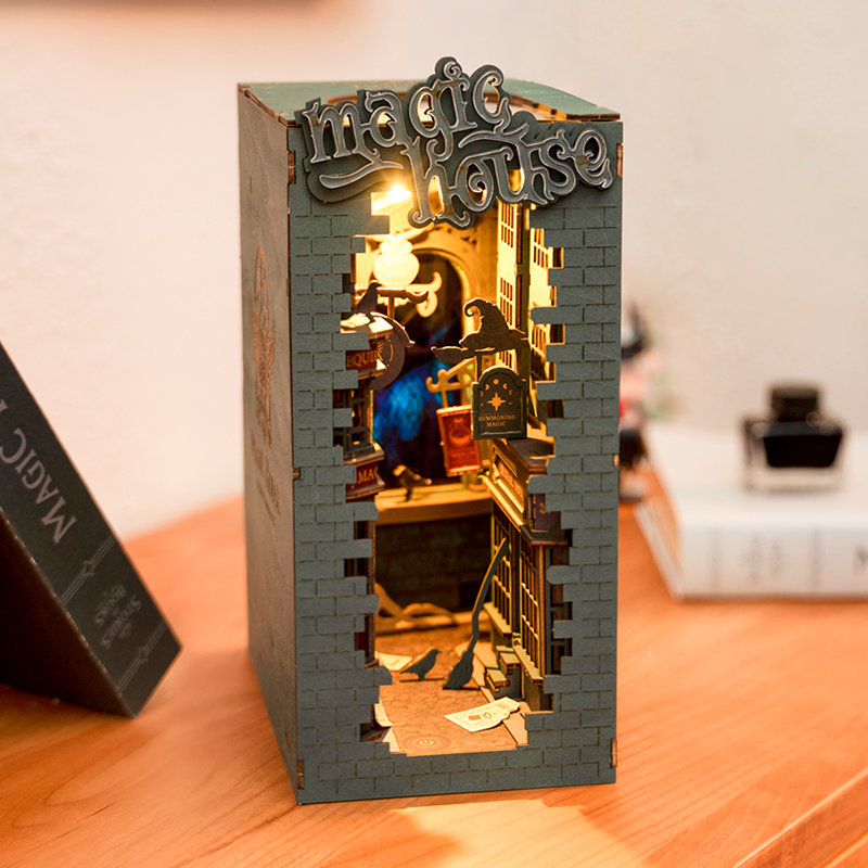 Dette miniaturebyggesæt giver din bogreol et drys magi, når det står og trækker blikket indad, nedad den lidt skumle og hemmelighedsfulde gyde, hvor man lige kan ane butikker og vinduesudstillinger, som vil få den mest ambitiøse troldmand til at måbe.Kræver 2 stk AAA-batterier, som ikke medfølger.De hører til vores udvalg af Voksenværk, som du kan læse om her, og som er en kategori med et rigt udvalg af fordybelse til voksne. Du finder hele udvalget her.Hyldetryllerier er en fantastisk serie af miniaturebyggesæt som vi aldrig har set dem før. De består af små trædele, der er udstandset og delvist farvelagt, så du behøver ikke hobbykniv eller maling.Du behøver heller ikke lim, da alle dele klikker sammen. En slibesten eller fint sandpapir er en god ide, og derudover kræver et Hyldetrylleri kun det samme, som alt andet i vores Voksenværk-udvalg: god tid, god belysning og lyst til fordybelse.Skulle du have lyst til at dekorere eller farvelægge dit Hyldetrylleri yderligere, er der rig mulighed for at tilføje flere detaljer.Når dit Hyldetrylleri er færdigt, kan det stilles i bogreolen, hvor det ligner et lille landskab, en hemmelig gyde eller en hyggelig krog med lys i, der kaster en helt utrolig stemning. Dine bøger bliver ellevilde med den nye nabo.