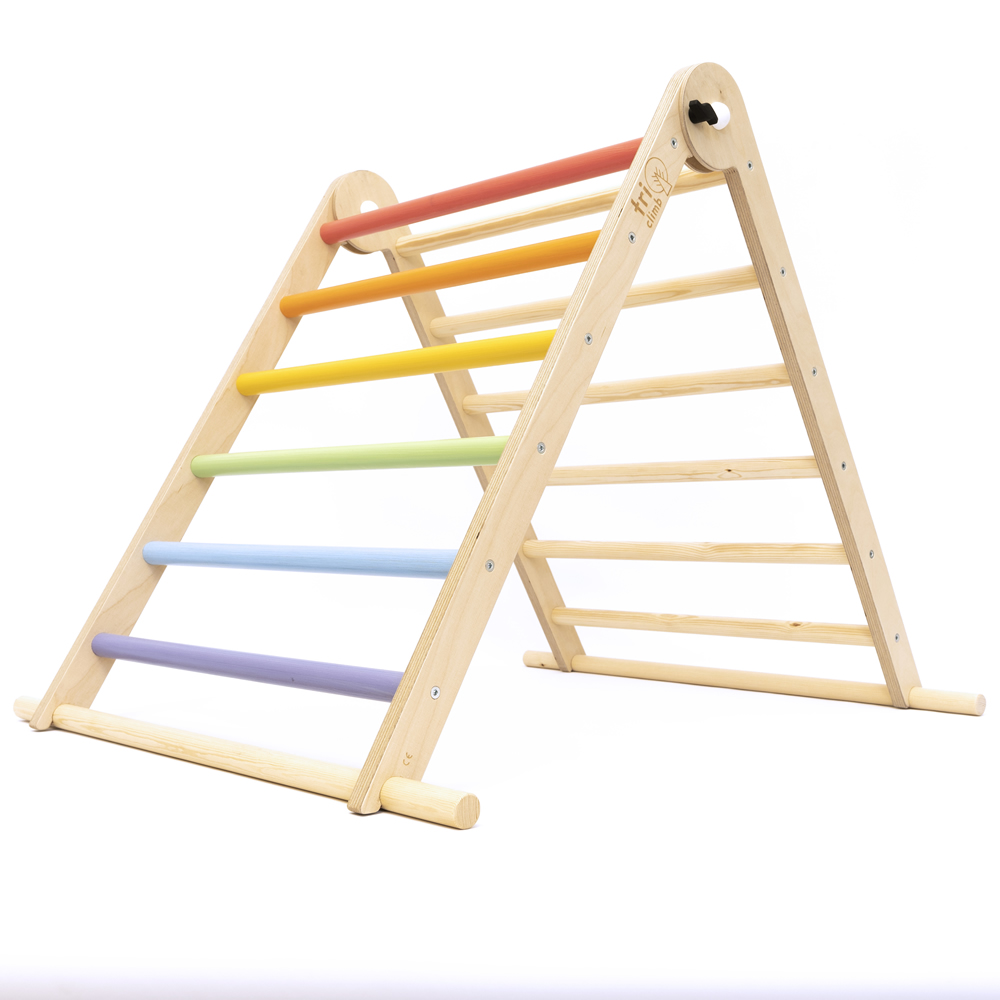 Opbyg dit barns selvtillid, fantasi, fin- og grovmotorik, muskel/ledsans og balance med et og samme vidunderlige og meget, meget lækre redskab - Triclimb er produceret i Wales og skudt ud af legekanonen lige her i legetanternes univers. Kors, hvor er klatrestativet Triclimb bare luksuriøs og anvendelig. En træramme med ribber to på sider, som kan stilles som en trekant, ligges på siden som et bur til vilde tigre, aktivitetsstativ til baby eller ramme til en hule, kravles over, under og på - og så kan det klappes sammen på to sekunder. Du kan sætte denne rutchebane/glidebane på. Den er bygget specielt til Triclimb klatrestativet og passer ikke til andre mærker af klatrestativ eller klatretrekant.Triclimb er opbygget med blik for, hvad børn ikke kan stå for. Helt små børn vil tage fat i siderne og lade Triclimb indgå som en støtte, når der forsøger at komme op at sidde og stå - og også begynde at kravle op ad ribberne. Triclimb står stabilt, så du kan med ro lade din baby eller hele vuggeren bruge den som motorisk redskab. Det er også oplagt at hænge babylegetøj på ribberne, når helt små babyer ligger på ryggen eller maven inde under trekanten som en slags tipi - prøv at hænge en lille lyskæde i, læg et tæppe over og se dit barns øjne lyse af fryd inde i babyhulen. Når dit barn er stærkt og modigt nok til at kravle op ad siderne, er toppen så smart indrettet, at der er to ribber øverst. Det giver en rolig base på toppen, så dit barn roligt kan kommer over på den anden side og kravle ned igen eller vende om og kravle ned ad samme side. Dit barn kan også lige sidde lidt på toppen og nyde udsigten og lege bjergbestiger - måske der vanker en clementin og en lille kop te på bjergets tinde?Triclimb kan nemt indgå i alle mulige former for fri leg, der udfordrer både dit barns fantasi og motorik. Hulebyggeri er oplagt, men løvernes bur i zoo ligner såmænd også, og hvis der er brug for et hyggeligt sted i fred for forstyrrelser til at hygge med en bo eller lige få fred i låget, så giver den robuste ramme en fysisk afgrænsning af dit barns rum, som ofte lige er det, der skal til efter en lang dag eller midt i en hektisk formiddag. Sæt Triclimb på siden ind i mod et hjørne, læg puder i, tæpper over siderne og find nogle gode tegneserier frem og måske en lille skål med lidt nærende guf til dit barns lille, lærende krop. Ahhhh...Denne version har regnbuefarvede ribber for at tilføre ekstra fine kulører til dit hjem, og så har dit barn spraglerier at se på - samtidig kan I tale om, hvilken farve ribbe, der nu skal indtages og dermed øve farvernes navne indimellem tigerspring og klatreaber.Specifikationer: Fra fødslen som aktivitetsstativ - kravleaktivitet starter omkring 9 mdrBelastningsgrænse er 100 kgFremstillet i WalesVandbaseret lak og malingSammenklappelig med et snuptag55 cm lang, 80 cm bred, 65 cm høj i opslået stand55 cm lang, 10 cm bred og 76 cm høj sammenklappet