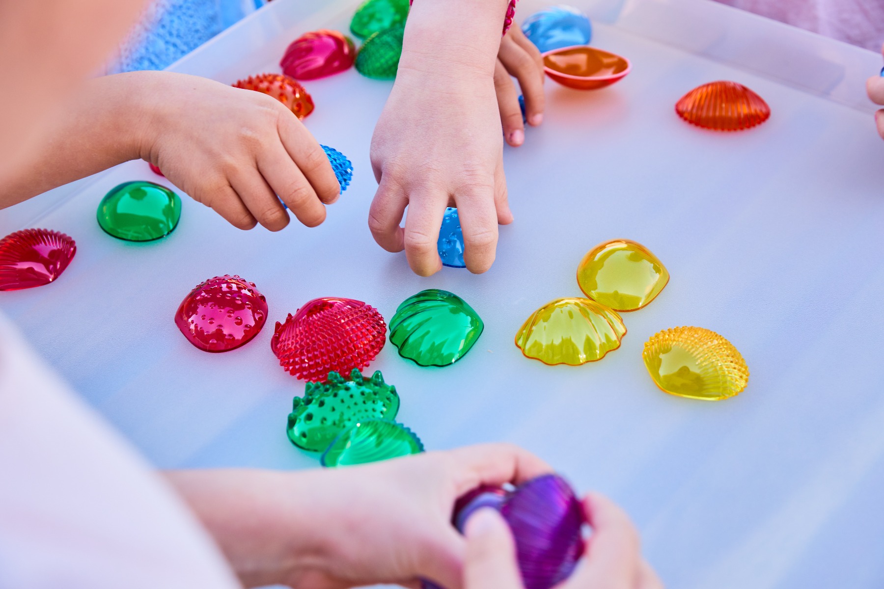 De er ikke til at holde fingrene fra, disse gennemsigtige skaller. De 108 skaller har 6 forskellige overflader og findes i 2 størrelser, og når dit barn leger med dem, stimuleres følesansen - deraf navnet taktilskaller. I kan lege med dem i kombination med sand, med vand, med forskellige typer legesand eller Kinetic Sand eller på et lysbord. Bland farverne og tal om dem, prøv at beskrive de forskellige overflader, skab ro ved at bede børnene om at sortere dem uden at bruge øjnene, tæl dem på engelsk, tal om størrelsesforhold, lav mønstre - der er utallige muligheder med de lækre taktilskaller. Med i den praktiske plastikbeholder er der også en aktivitetsguide.De store skaller måler 5,4 cm, de små 4 cm.