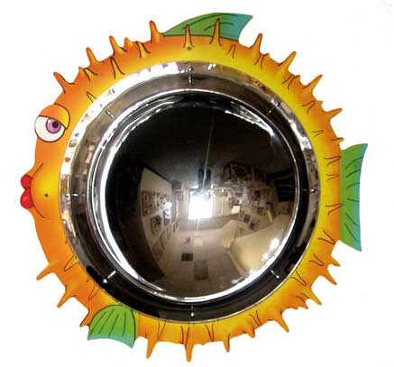 Dette unikke spejlpanel med klumpfisk-motiv skaber en fascinerende optisk illusion, der vender spejlbilledet på hovedet. Panelet har en usædvanlig stor dybde, hvilket giver en overraskende effekt, når børn står foran det og bevæger sig.