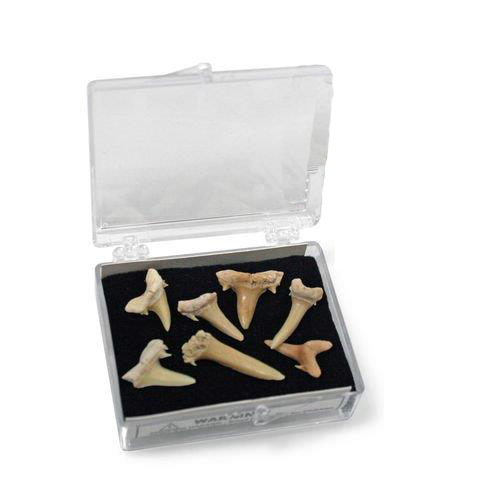 Dette er ægte hajtænder (... som i rigtige hajtænder!) fra en haj, der har levet for et sted mellem 5-7 millioner år siden!Nu er der mulighed for, at det kan blive dine børns. Det skaber respekt i skolen, når man pludselig har et haj-tandsæt i penalhuset, og det er virkelig fascinerende at se på dem, undersøge dem, måle dem og læse om dem på bagsiden af æsken.Str. varierer fra 1-2 cm. Antal kan variere alt efter størrelse.Fra 3 år - kommer i transparent æske