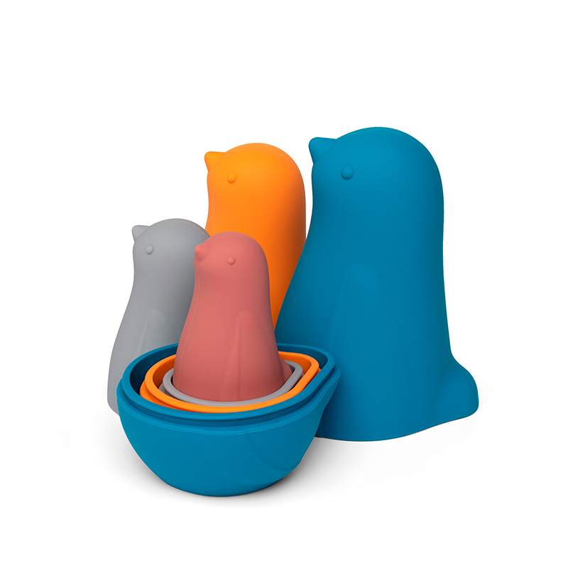Fire kære fugle af silikone, som passer ind i hinanden og er lige til at tage med udenfor eller give et fuglebad.Den højeste er cirka 15 cm.