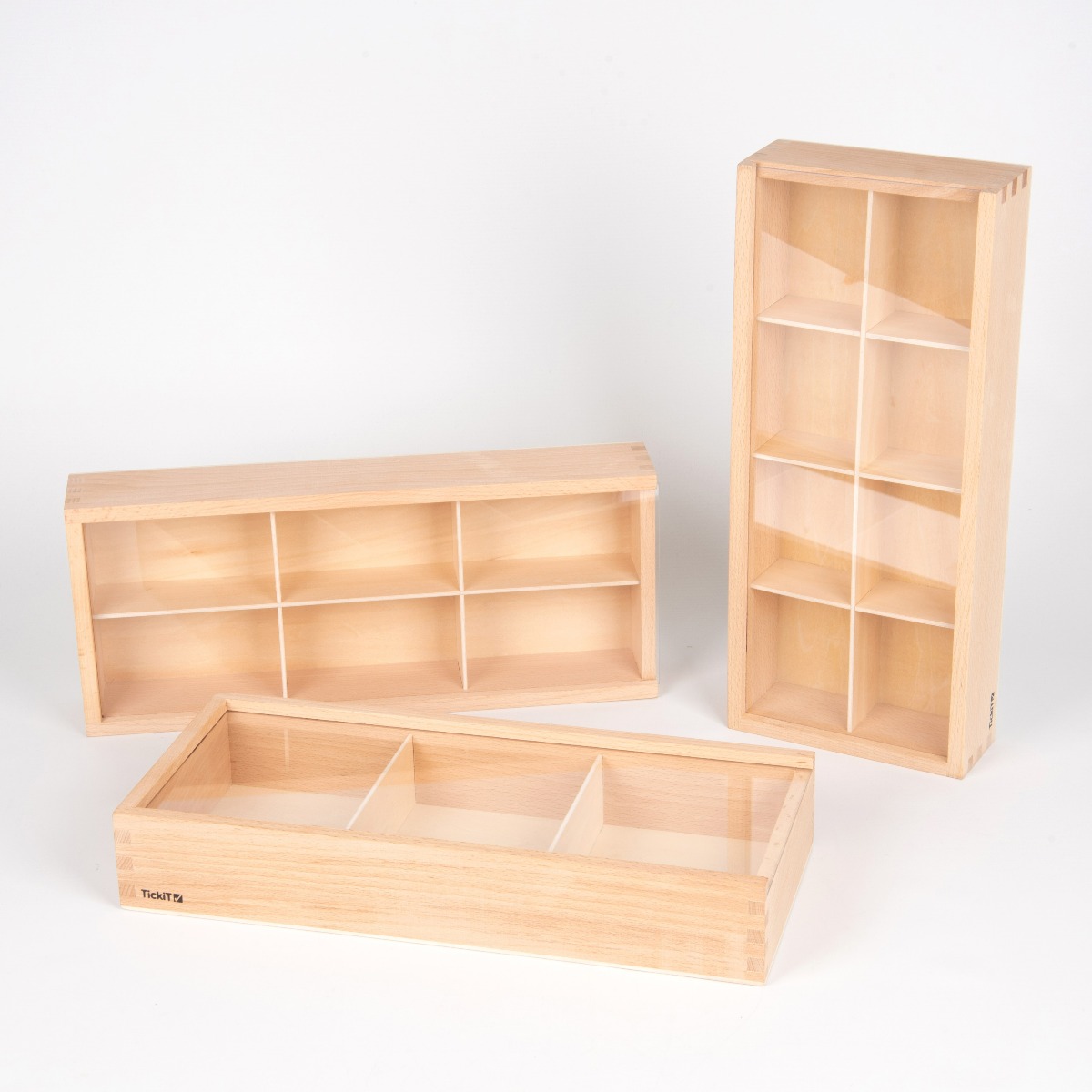 Æskerne her er af bøgetræ, har forskellige størrelser og har alle et gennemsigtigt akryllåg, som kan slides af og på. Hvad skal æskerne indeholde? De store rum måler 20,3 x 9 cm og de små rum måler 13,4 x 9 cm.Skal de fyldes med knapper, eller synåle, målebånd og sytråd? Udvalgte byggedele eller de mindste dimser til dukkehuset? Øskner og andre små dimser til smykkefremstilling? Eller måske de flotteste skatte fra weekendens tur til stranden eller skoven som skal udstilles?Mulighederne er uendelige, når dims og dut skal sorteres eller vises frem i æskerne.Brug æskerne til lege med observation, indsamling og sortering af skatte eller små stykker legetøj. Sæt ord på, hvorfor dit barn sorterer som det gør - det styrker ordforrådet og evnen til at reflektere og begrunde.Du får alle 3 trææsker på billedet.