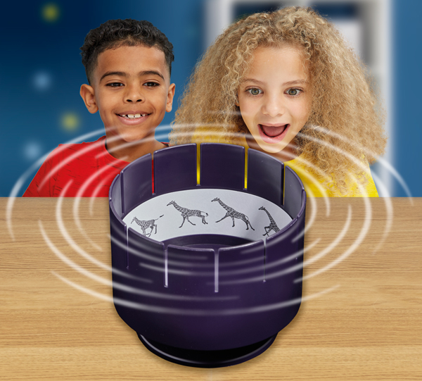 Den her fine fætter er en zoetrope. Når man sætter en stribe tegninger eller billeder inden i den og drejer den hurtigt rundt, ser det ud som om, at billederne bevæger sig. Den blev opfundet for 200 år siden, og den er stadig et fantastisk stykke mekanik, der vil få dit barn til at spærre øjnene op.Med denne zoetrope følger der 18 striber med billeder og 6, som dit barn selv kan tegne på. Der er også en hemmelig kode til online informationer om historien og videnskaben bag en zoetrope, for denne teknologi påvirker nemlig stadig den måde, man laver film i dag.