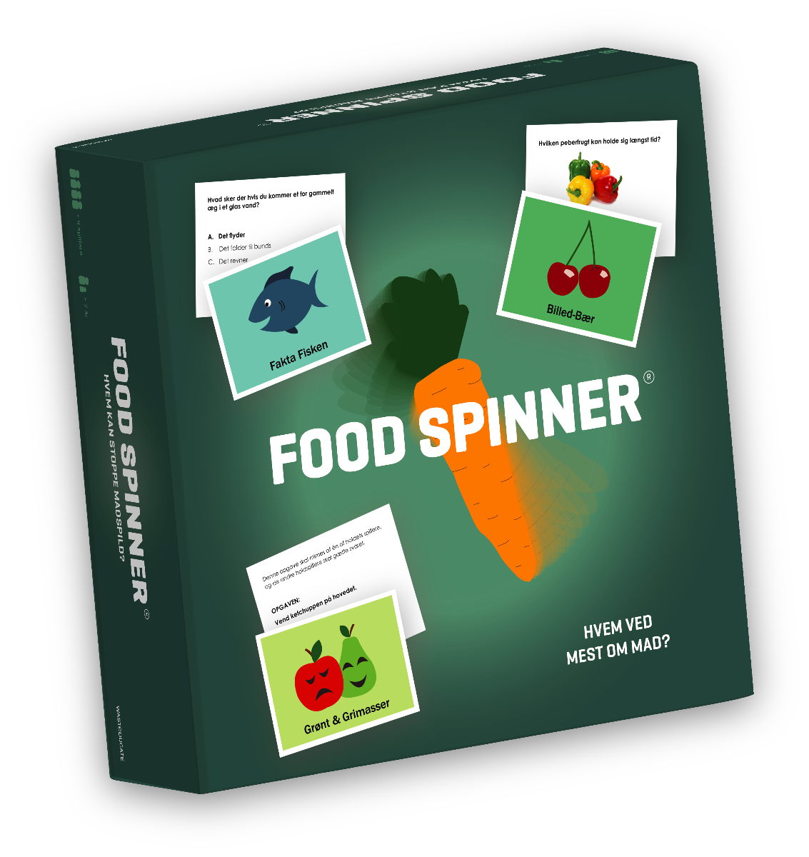 Et sjovt spil for 4-12 spillere, som udvikler børnenes viden om mad og holdbarhed. Der er fokus på 3 læringsstile, nemlig kropslig, visuel og sproglig, og der er masser af sjove opgaver og spørgsmål, som kan bruges som et afbræk i madkundskabsundervisningen, i frikvarteret eller som en del af et madspildsprojekt. Her er et par eksempler på spørgsmålene i spillet, så du kan fornemme, hvor lærende og sjovt Foodspinner er: 1. Hvad sker der hvis du kommer et for gammel æg i et glas vand ? A) Det flyderB) Det falder til bundsC) Det revner 2. Hvilke frugter kan modne andre frugter og grøntsager ? A) Æbler og pærerB) Ananas og grapec) Jordbær og kirsebær 3. Hvor mange kroners madspild laver Danmark i december måned ? A) Ca. 0,5 mia. krB) Ca. 1,5 mia. kr.C) Ca. 3,5 mia. kr. 4. Inden for hvilken kategori er der mest madspild ? A) Frugt og grøntB) Mælk, æg og mejeriprodukterC) Kød og kødprodukter 5. Hvor mange jordkloder skulle vi bruge, hvis alle havde et madforbrug som danskerne ? A) 2,5B) 4,5C) 6Det tager ca 40 minutter at spille Foodspinner