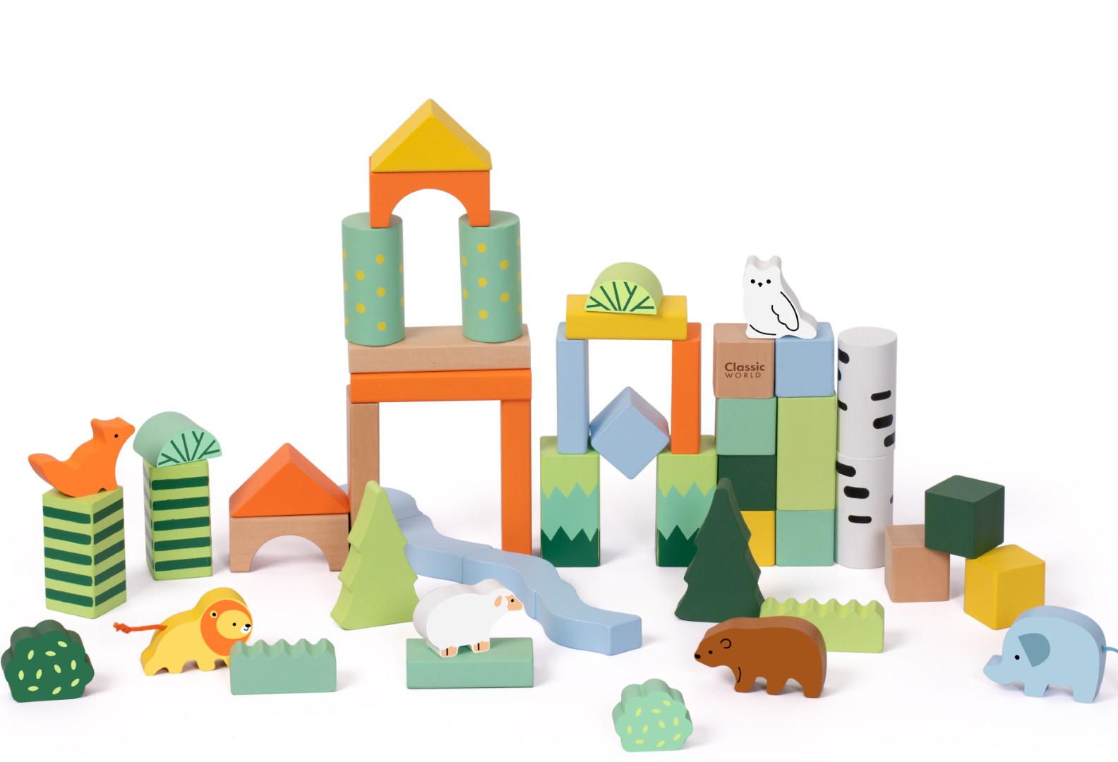Classic World Forest Blocks – Skovtema Byggeklodser (fra 18 mdr.) Byg din helt egen eventyrlige skov! Dette sęt består af 50 flotte tręklodser i forskellige former og farver, inspireret af naturen. Blandt klodserne finder du sųde dyr som lųve, brun