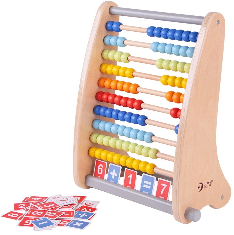 Denne farverige kugleramme giver barnet mulighed for at laere forskellige evner afhęngigt af alder og udvikling. Barnet kan starte med at trille kuglerne og genkende farverne, og senere bruge kuglerammen til at oeve simple regnestykker med de medfoelgende