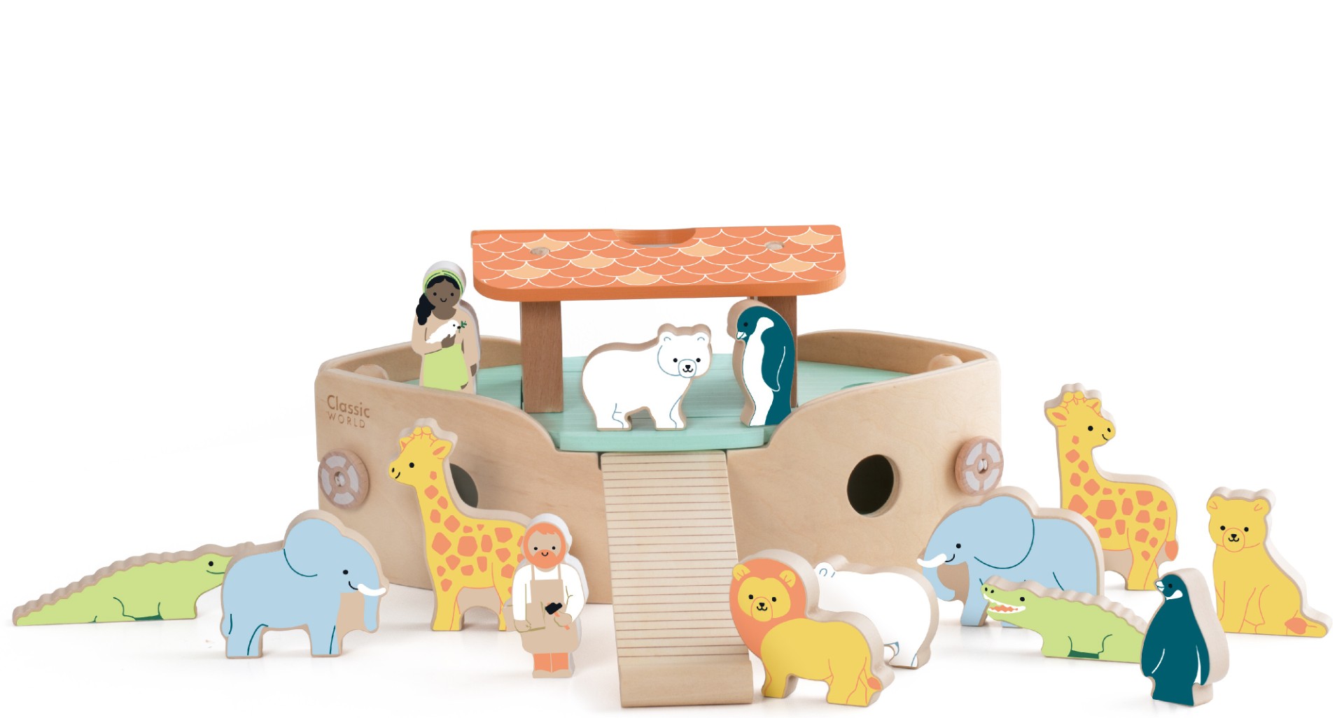 Classic World – Noahs Ark Byggesæt (fra 18 mdr.) Tag med på eventyr og byg Noahs Ark! Med dette fine trælegetøj kan børn nemt samle arken og lege med de medfølgende figurer. Sættet indeholder par af dyr som løver, giraffer, elefanter, pingviner og m