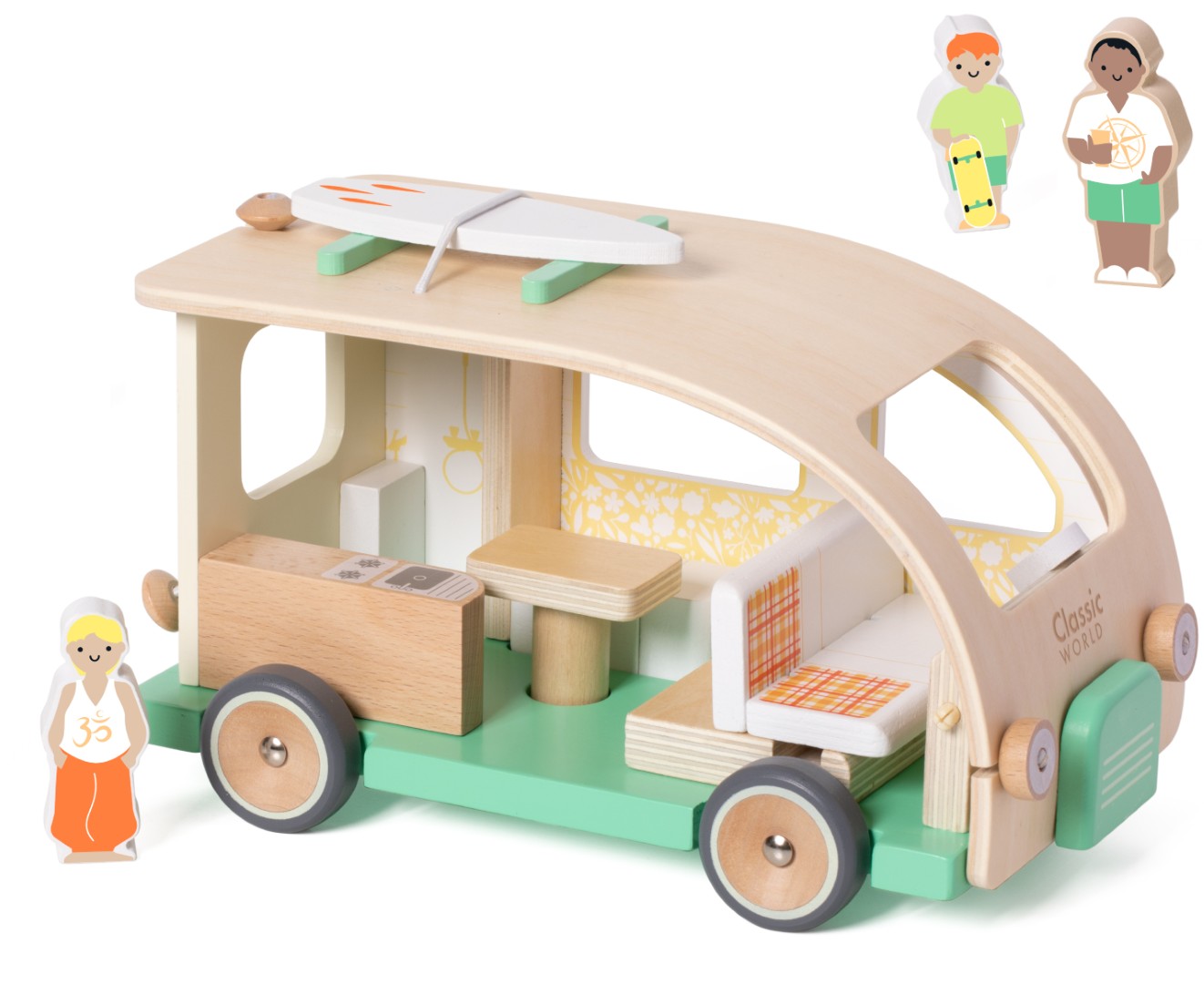 Classic World Camper Van – Trę autocamper med figurer (fra 18 mdr.) Tid til roadtrip! Denne fine trę-camper er perfekt til fantasifulde familieeventyr. Camperen er indrettet med alt, hvad man behųver på turen – kųkken, toilet og soveplads &nda