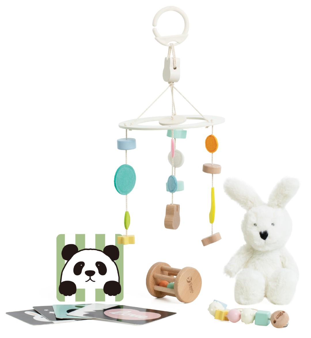 Det er et gave-sæt til nyfødte over 0 måneder, som indeholder rige legetøj som en plysdukke, mobil til vuggen, sensoriske sort-hvide kort osv. Opbyg og styr deres evner på en afbalanceret måde. Alder: fra 0 måneder. Størrelse: 57 x 29 x 40 cm Materialer: