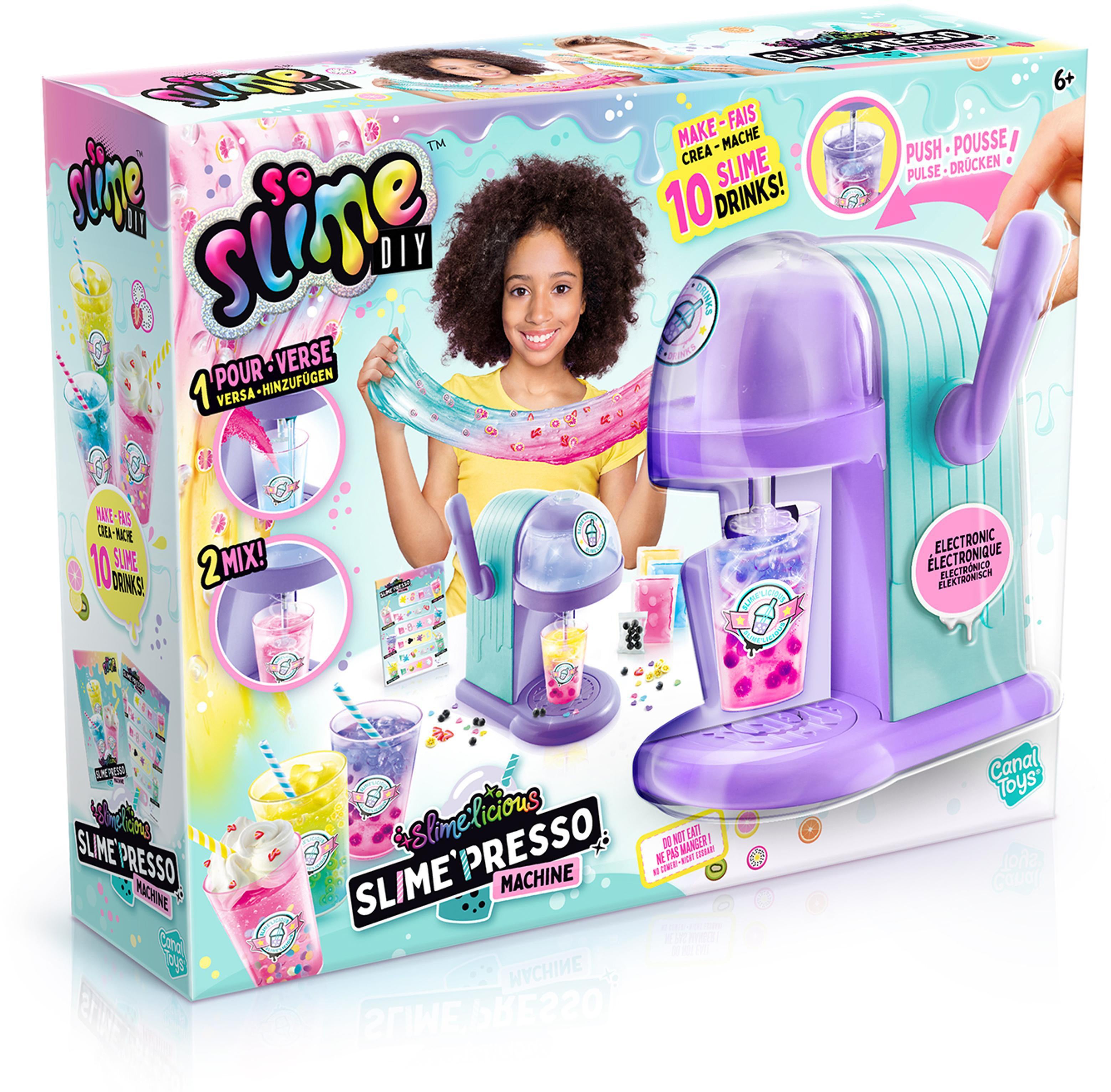 Legesæt fra So Slime med en elektrisk blender, så du kan skabe dit eget slime. - Skab slime-drinks. - Bland pulver og vand for at lave slime og tilføj derefter dekorationer. - Indeholder: 1 elektrisk blender, 2 piberensere, 1 opskriftskort, 10 slimepulvere, 5 slime, 3 kopper, 8 poser med pynt, 3 sugerør. - Kræver 3 stk. AA-batterier (medfølger ikke). - CE-mærket. - Anbefalet alder: Fra 12 måneder.
