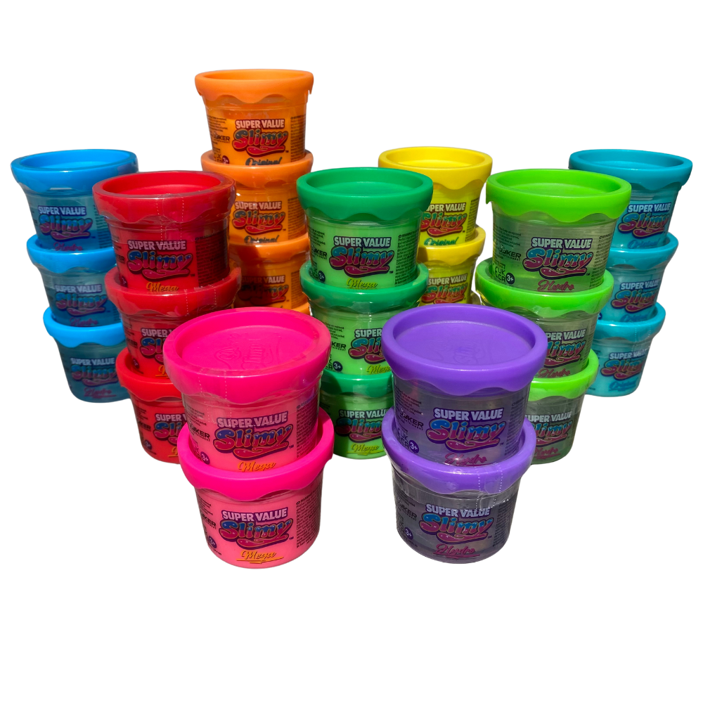 Her er 3 typer slim fordelt på en hel meter af små bøtter. Original, Mega og Hydro Slimy i forskellige farver. Stik fingrene i det lækre slim og find jeres favorit.Den originale er virkelig snasket og ethvert gulvtæppes skræk, Mega er elastisk, slipper fingrene og er dejligt slimet at røre ved, mens Hydro er mere fast og vandagtig/gennemsigtig og siger en skøn lyd, hvis du klasker den ned i voksdugen.Udviklet i Schweiz.