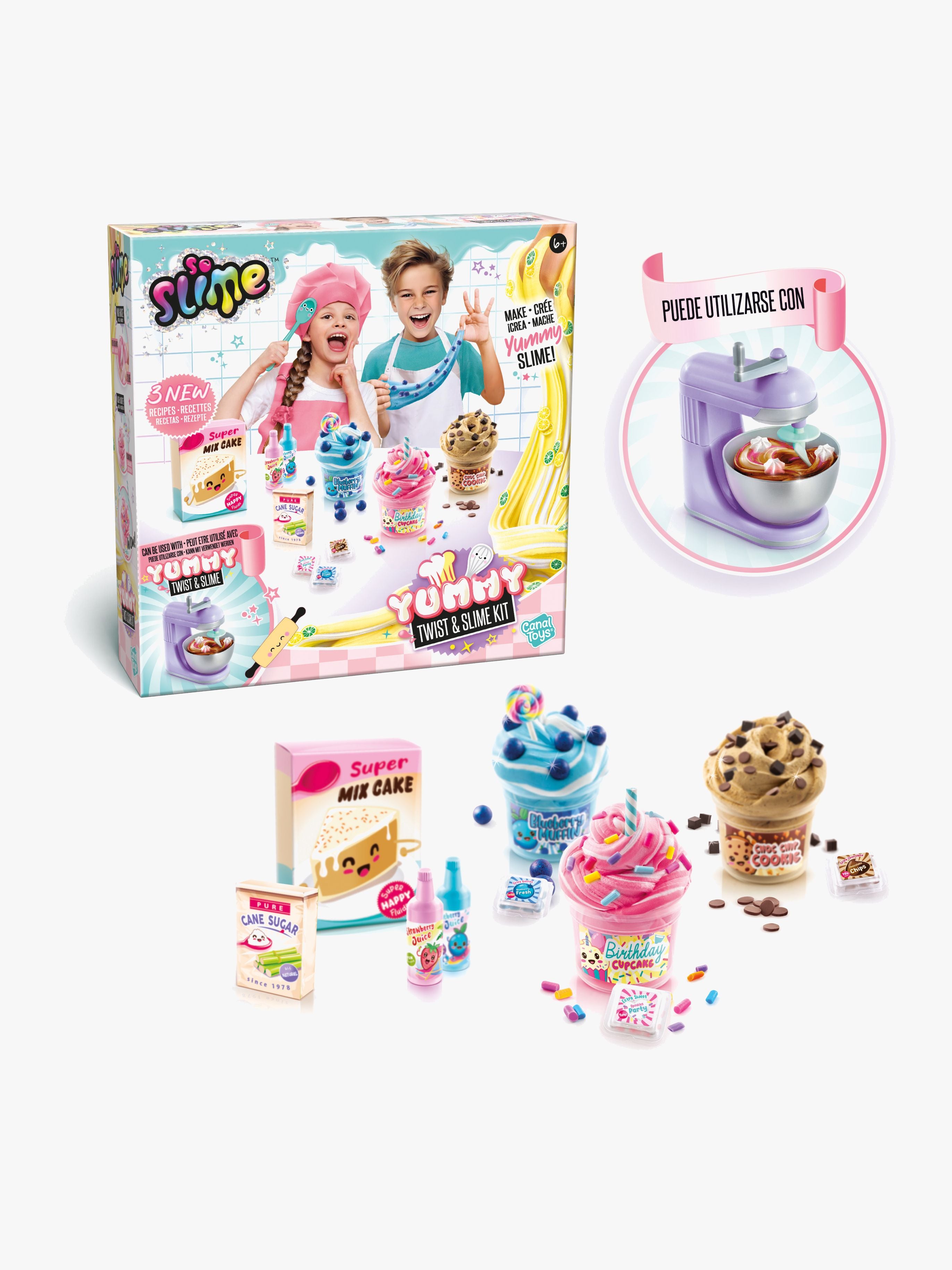 Sjovt slimesæt fra So Slime med tre forskellige farver. Perfekt til kreative aktiviteter. - Indeholder: 1 mikser, 1 tube glasur, 1 kageblanding, 1 pose rørsukker, 1 chokoladepulver, 2 glasurer, 2 flasker farve, dekoration. - Mix og match slime og dekorationer. - Fremmer den sensoriske udvikling. - Let at bruge. - Stimulerer dit barns kreativitet. - CE-mærket. - Anbefalet alder: Fra 6 år.
