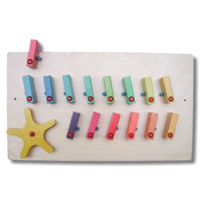 Flot vægpanel i træ og i mange farver.Dit barn skal rejse brikkerne lodret op, når det er gjort lader han eller hun den øverste brik falde nedad, hvilket medfører en dominoeffekt.Når dominobrikkerne rammer et hjul, kører det rundt.Et vægpanel der fascinerer.Str. 48 x 27,5 cm.