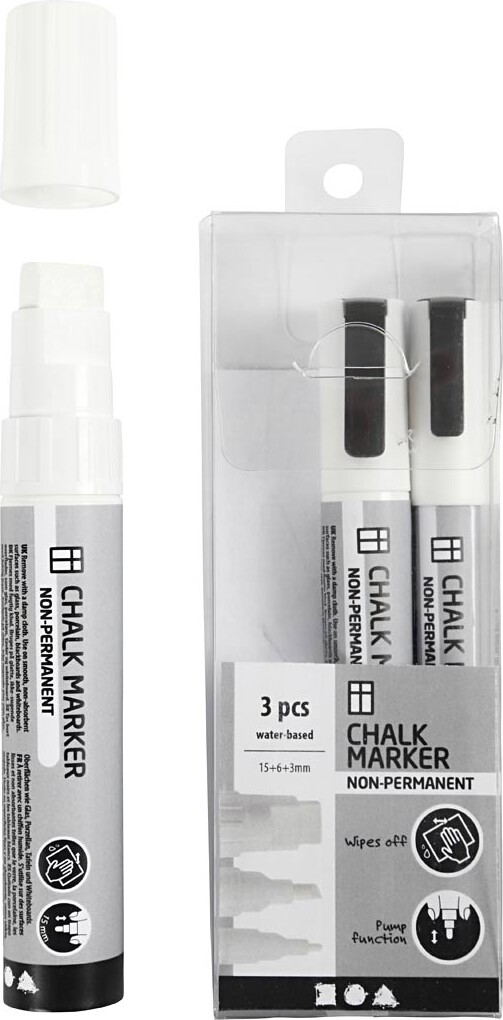 Vandbaseret, non-permanent, afvaskelig tusch med en kalk-/kridtagtig overflade. Kalk-/kridttuschen kan bruges på alle glatte og ikke-sugende overflader som vinduer, glas, porcelæn, plast, spejle og...