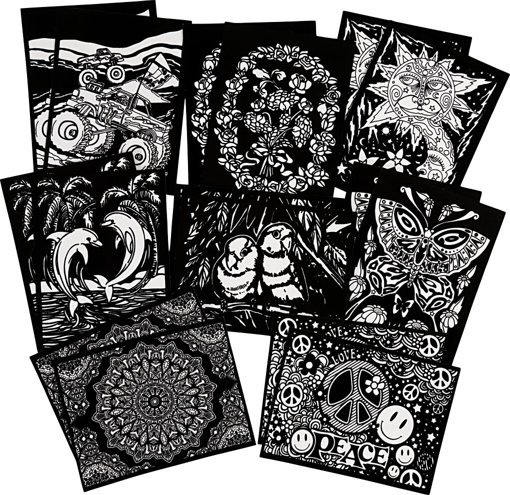 Find kreativiteten frem med disse smarte velourbilleder! Du får her 16 sorte velourbilleder med forskellige motiver. De flotte motiver kan farvelægges med tusser, farveblyanter, fedtfarver og...