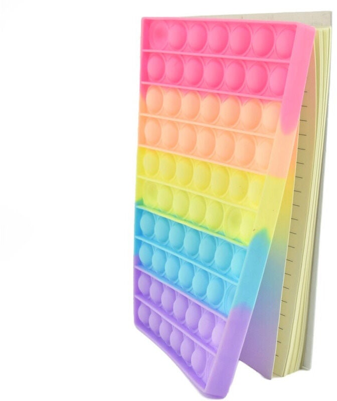 Notesbog fra Robetoy med et sjovt Pop-it fidget-legetøj foran med forskellige farver. Den har linjerede, gule sider indeni. Perfekt til kreative aktiviteter. CE-mærket. Linjerede sider. Både en notesbog og et fidget-legetøj. Anbefalet alder: Fra 5 år. Plastik, papir.