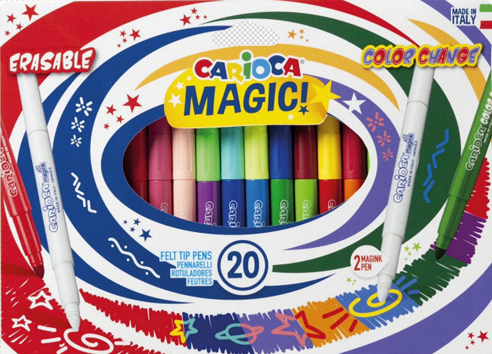 Magic fibertusser fra Carioca med mange flotte farver. Perfekte til alle, der holder af at tegne og farvelægge. - Intensive farve, der ikke bliver bleget af sollys. - Udviskelige fibertusser. - 6 mm spids. - Let at opbevare. - Perfekt til din lille kunstner. - 20-pak. - CE-mærket. - Anbefalet alder: Fra 3 år.