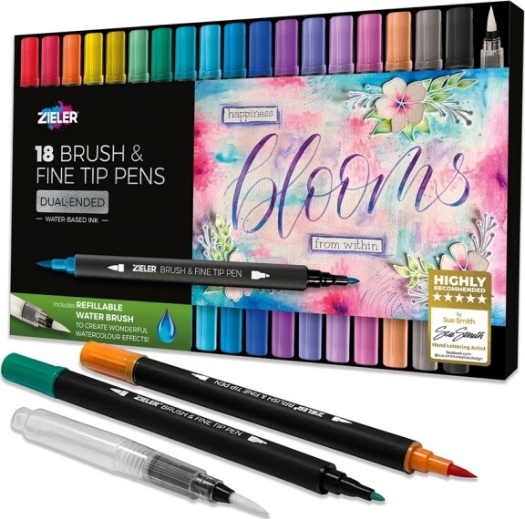 Zieler - 18 Brush & Fine Tip Pens - Dobbeltender - Vandbaseret