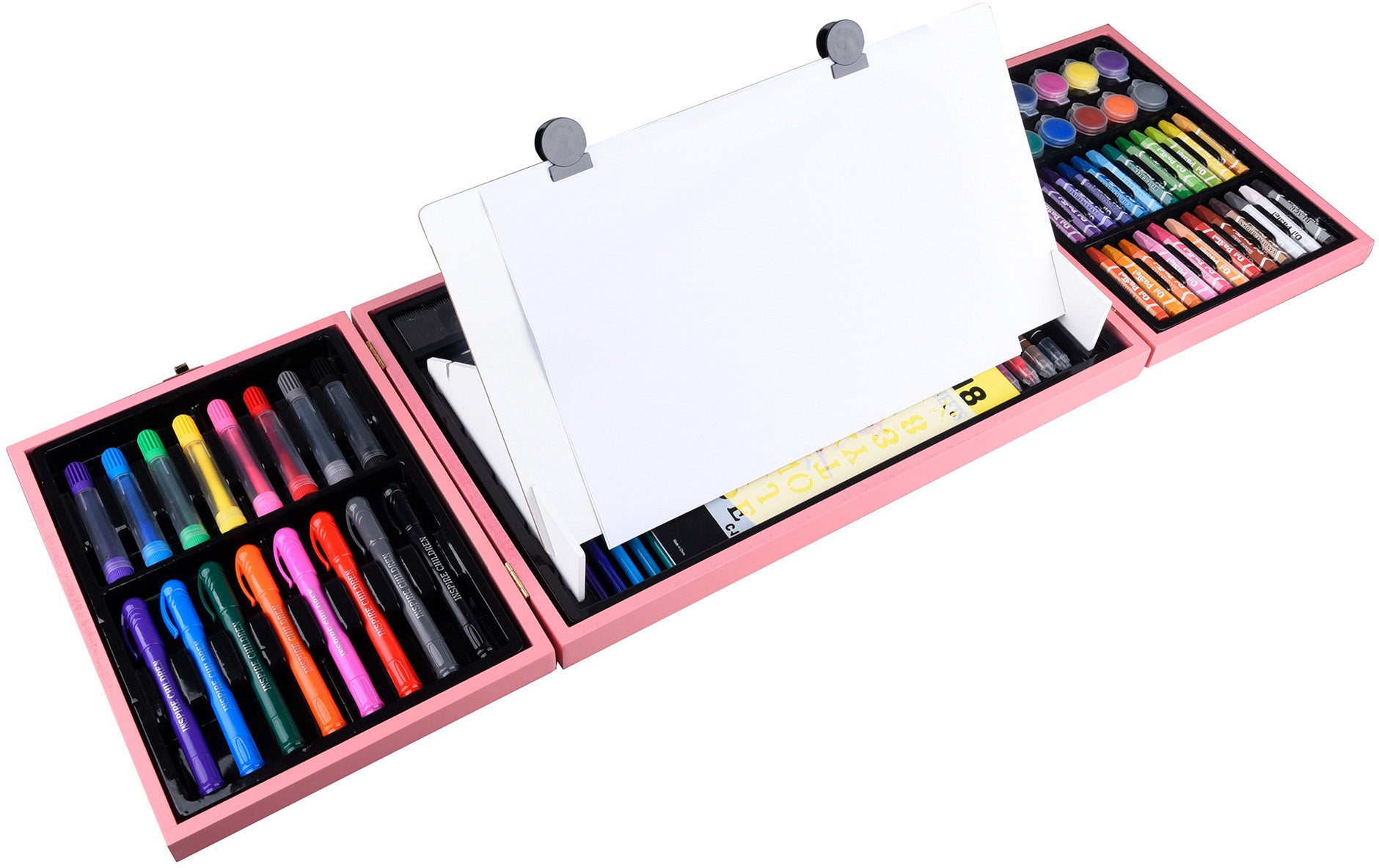 Sættet indeholder 12 vandfarver, 8 farvekridt, 12 farveblyanter, 24 oliepastelfarver, 20 tusser, 1 HB-blyant, 1 pensel, 1 blyantspidser, 1 viskelæder, 2 limflasker, 1 lineal, 1 staffeli, 42 klips, 1 tegneblok og 1 bogstavsskabelon. Dette omfattende udvalg giver børn mulighed for at eksperimentere med forskellige kunstteknikker og medier.