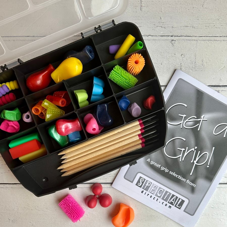 Stort sæt til hele klassen, så børnene kan vælge sig det greb, der hjælper dem bedst til et godt greb om blyanten.Der følger vejledningshæfte med fuld af tips til at bruge grebene og vælge det rette, der ikke belaster fingrene. Med praktisk opbevaring, så I kan holde styr på de mange typer, så det ikke bliver rodet helt sammen.